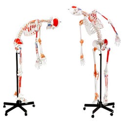 This human muscular skeleton model provides an incredible amount of realism and a superior level of detail for examining the human skeleton. Numbered details, moveable joints, flexible spine and removable head, deconstructable skull and jaw allow for thorough examination. The model features painted muscle origins and insertions on it's left side. The right side features ligament details. In addition, the model shows vertebral arteries, spinal nerves and intervertebral discs. The skeleton is natural size and has natural coloring (excluding painted details). Features realistic textures and bony landmarks, making this an excellent tool for students and medical demonstrations. Includes rod mount with rolling base, a corresponding keycard, a plastic dust cover and a laminated, 23 x 16-1/2 inch anatomical chart showing an in depth view of the human skeletal system. No tools are needed for this model's simple assembly. Model is cast from high quality, durable PVC plastic allowing it to withstand years of instructor and student use. Easy to clean.