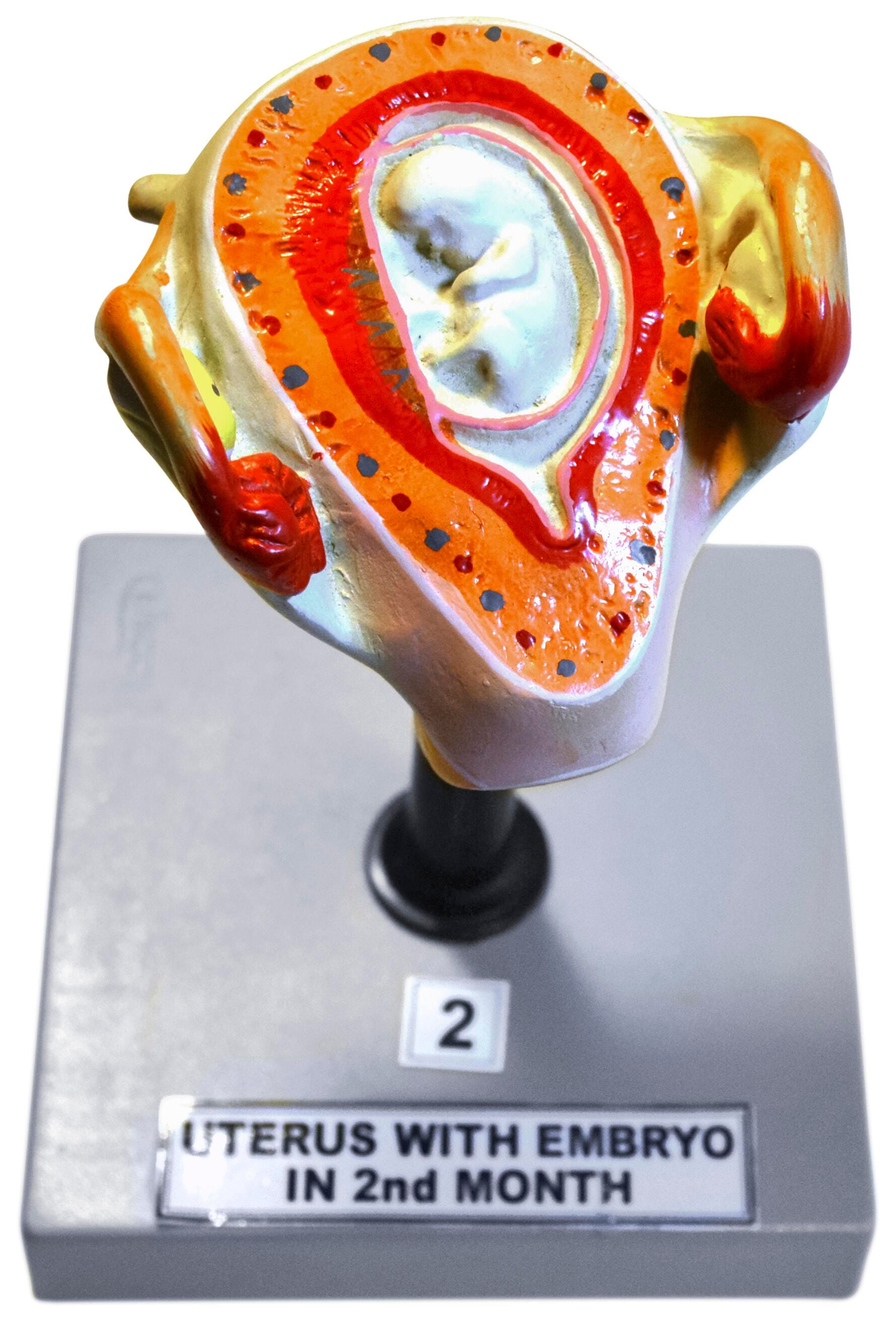Detailed 3D renderings of the development of the human fetus (in all 8 stages) offer a visual and kinesthetic ideal aid for studying the complete gestation of a human baby from the embryo stage to month 7 (which shows twins). Each stage is clearly labeled and months 4 to 7 have fetuses that are removable to show how the umbilical cord connects them to the mother for nourishment. Each of the 8 stages has a base, stand, and uterus with embryo/fetus. All bases have diameter of 4-9/10 x 4-9/10 x 1 inches.