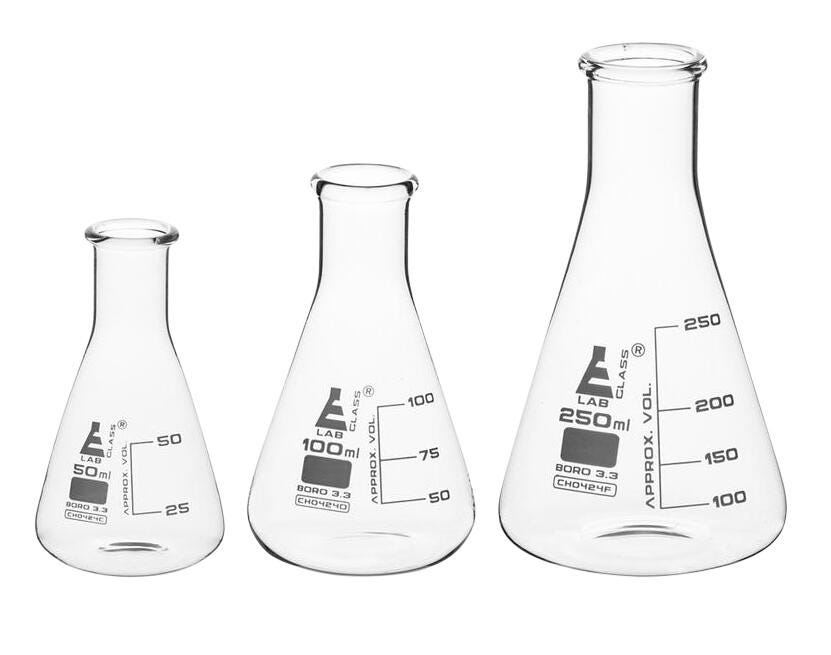 Three-piece Erlenmeyer Flask set is made of high quality, heavy duty, borosilicate 3.3 glass. Includes three, narrow neck flasks with 50 milliliters, 100 milliliters and 250 milliliters capacity. Flasks feature white, printed graduations, and beaded rims. Uniform, thick walls provide excellent strength against breakage. Set is packaged in a custom fit, thick foam casing, for safe storage and worry free transport.