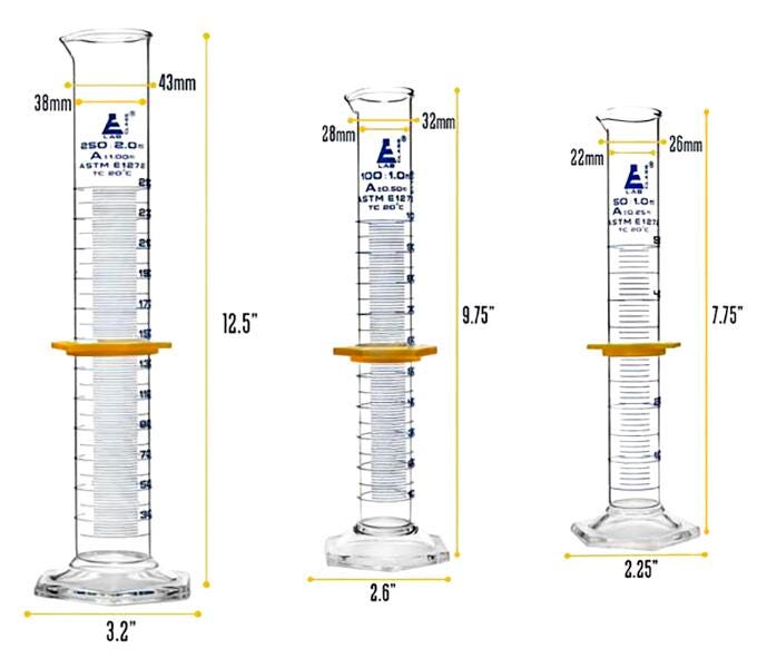 Three piece Measuring Cylinder set made of high quality, heavy duty, borosilicate 3-3/10 glass. 50ml, 100 and 250 milliliter capacities. Each cylinder features a spout for easy pouring, and hexagonal base for extra stability. Class A tolerance, per ISO/ASTM. All are fitted with a plastic, hexagonal protective collar. Set is packaged in a custom fit, thick foam casing, for safe storage and worry free transport.