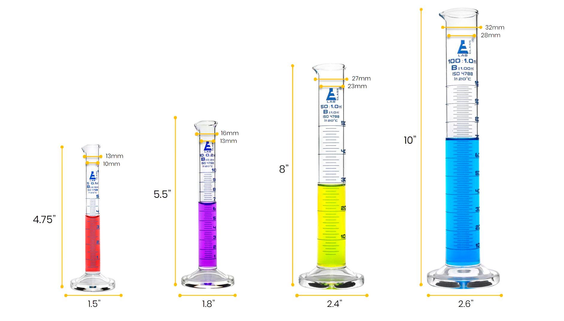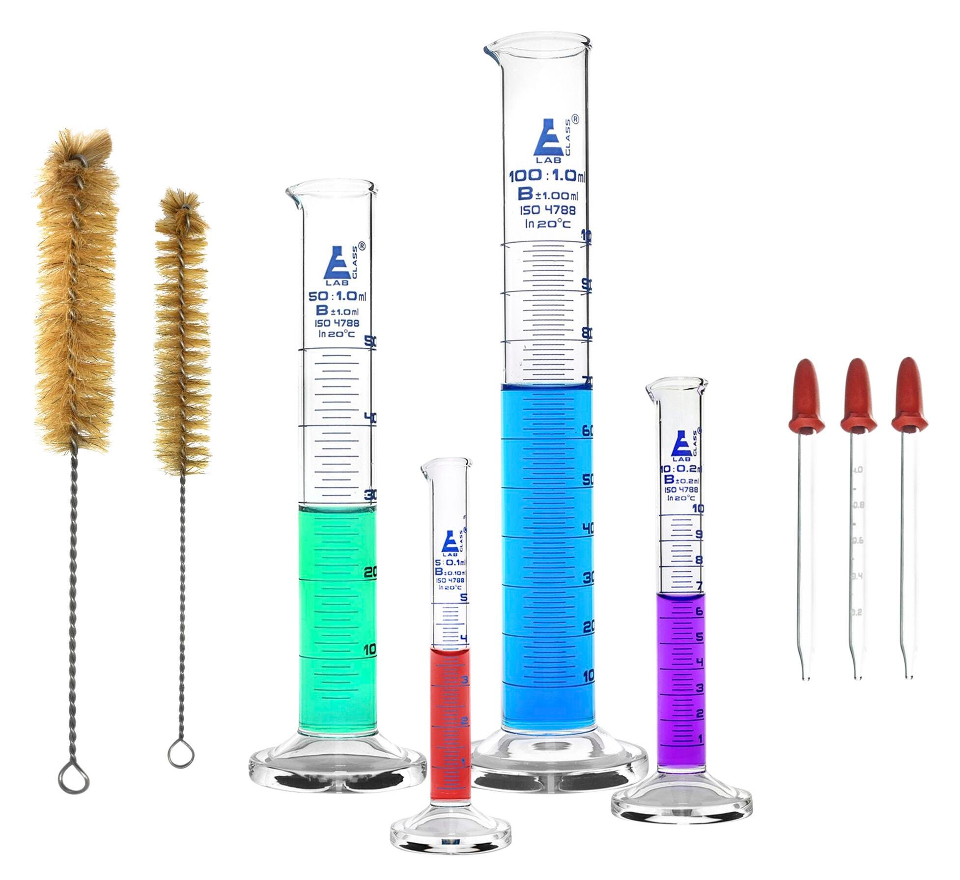 8 piece Measuring Cylinder set. Includes four graduated cylinders with 5ml, 10ml, 50ml, and 100ml capacities. Class B. Cylinders feature blue, printed graduations, round bases and spouts. Uniform, thick walls provide excellent mechanical strength against breakage.Features
