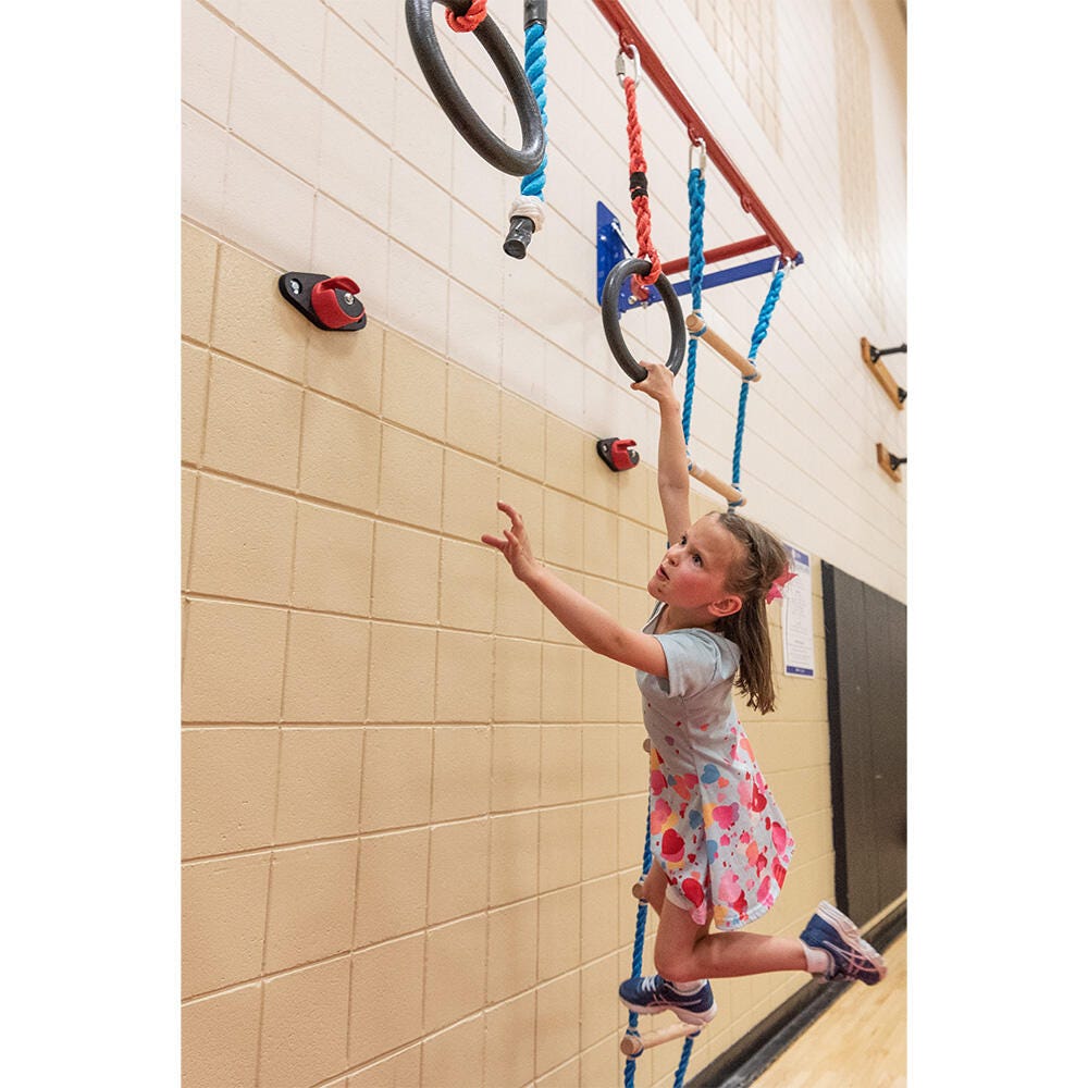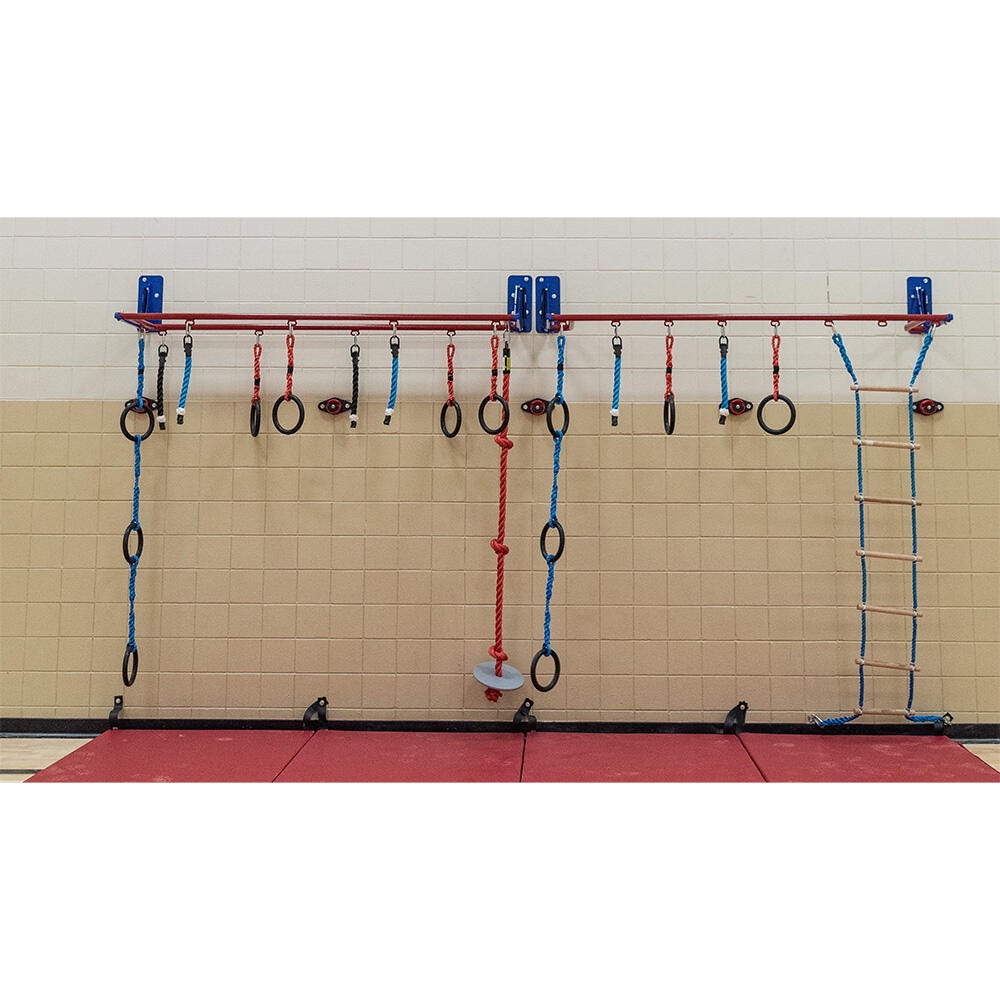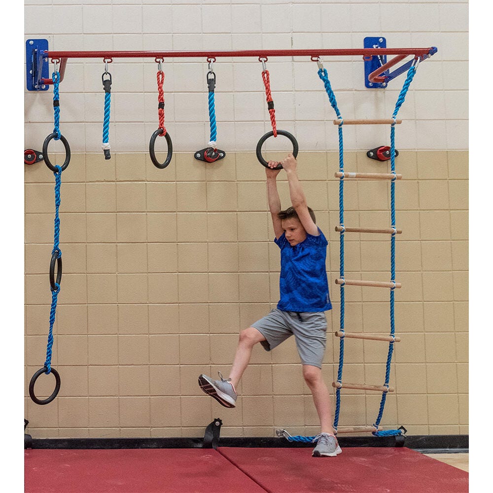The Large Safari Ninja Circuit Package improves coordination and builds strength. Includes frame, brackets, four Single Rings, one Triple Ring, four 18 inch Knotted Ropes, one 7 foot Knotted Rope with Disc and 2 inch safety mats. The element folds up and locks against the wall to easily prevent unauthorized use.
