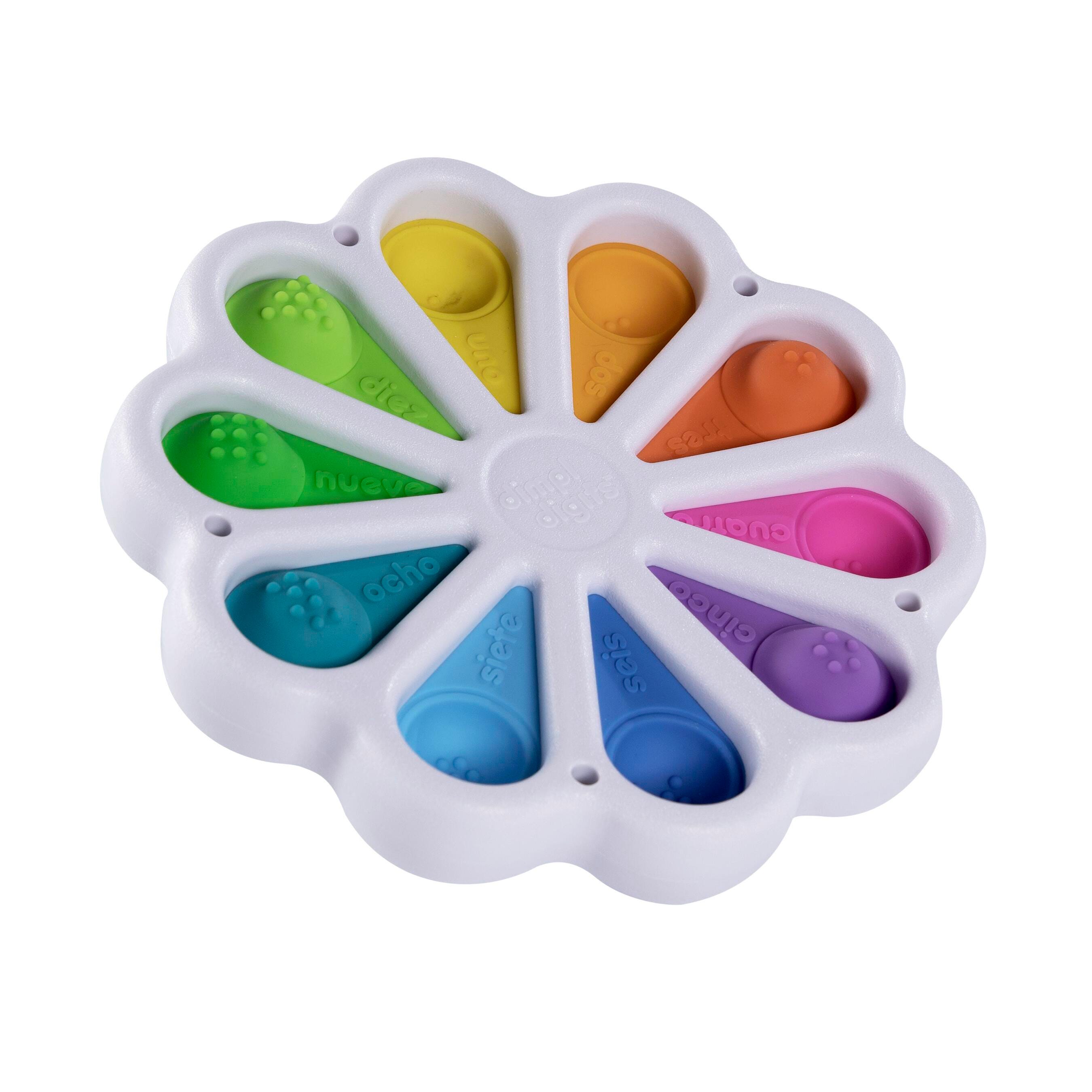 Touch, push, pop, and learn! On one side, the silicone buttons are embossed with numerals 1 through 10, each accompanied by its matching word in English. Flip it over and you'll find the words written in Spanish, plus dots to feel and count. Little fingers can't resist this number-learning delight! Measurements are 9 x 9 x 1-1/2 inches. Appropriate for ages 24 months and up.