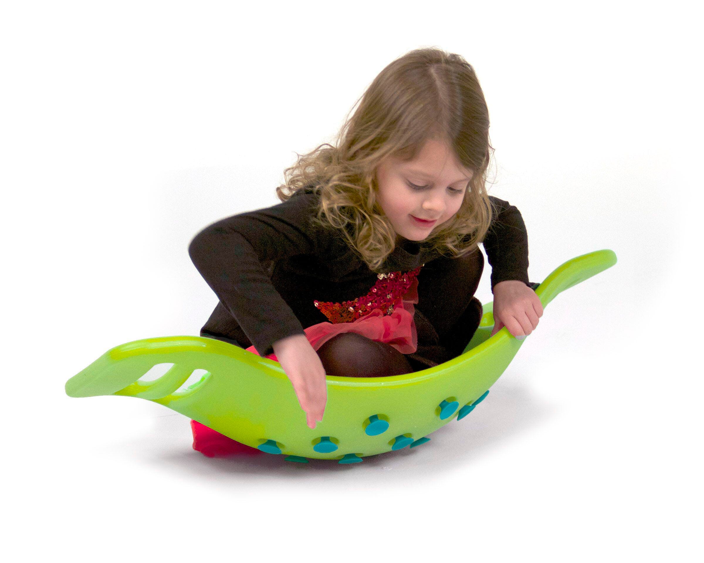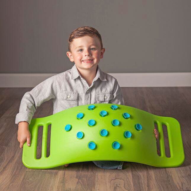 Fat Brain Toys Teeter Popper is a fun instrument for play... how it's used is up to the child! Whether they rock it, roll it, sit in it or stand... children want to move with Teeter Popper! Children find themselves teetering on the brink of perfect physical play. No special skills needed. In playful exploration, Teeter Popper improves core strength, stability, leg strength, balance, coordination and gross-motor skills. Measures 28 in L x 11-1/2 in W x 7-1/2 in D. Weight limit: 110 lbs. Green color with blue accents. Ages 3 and Above.