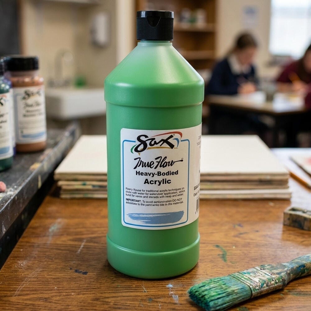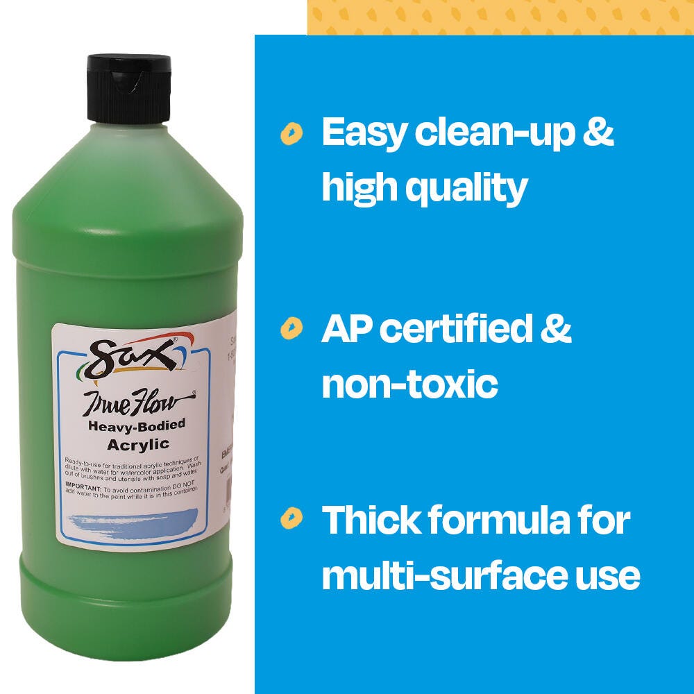 This Sax heavy body acrylic paint in an emerald green color comes in a convenient 1 quart bottle to accommodate the classroom. Non-separating and intermixable for a range of hues, our art paint is easy to apply. This paint dries to a matte finish and is ideal for traditional acrylic painting as well as block printing or silk screening. Enjoy excellent flow, coverage, blending, and drying for a variety of projects. Use the classroom paint for school assignments, art classes, group painting, or background canvas painting. Each acrylic paint comes in a durable plastic container for convenient handling and storage. Not recommended for outdoor use.
