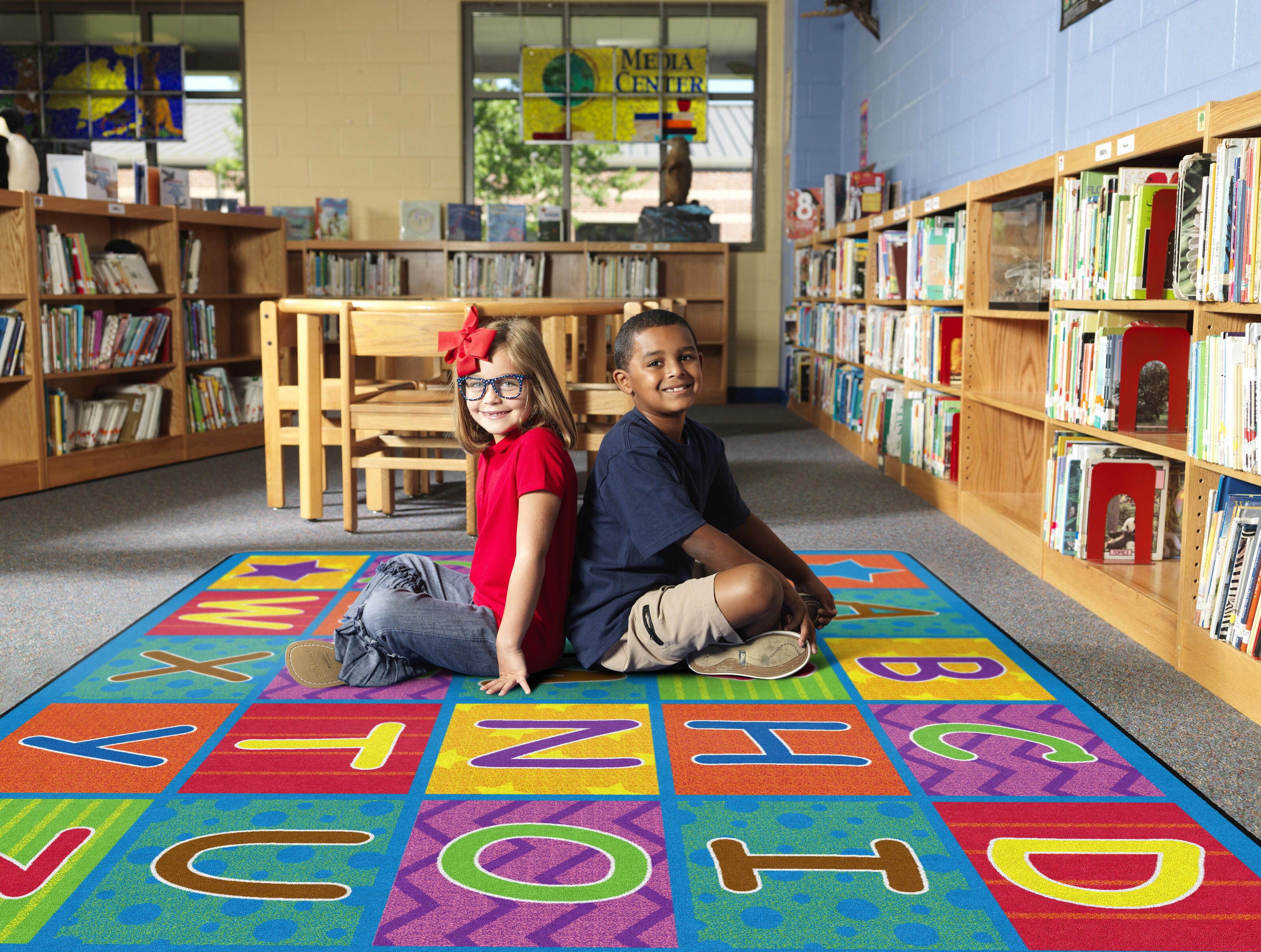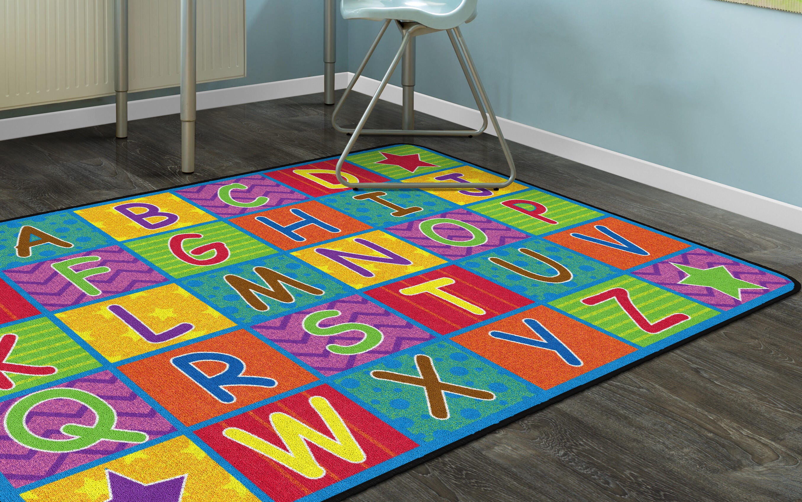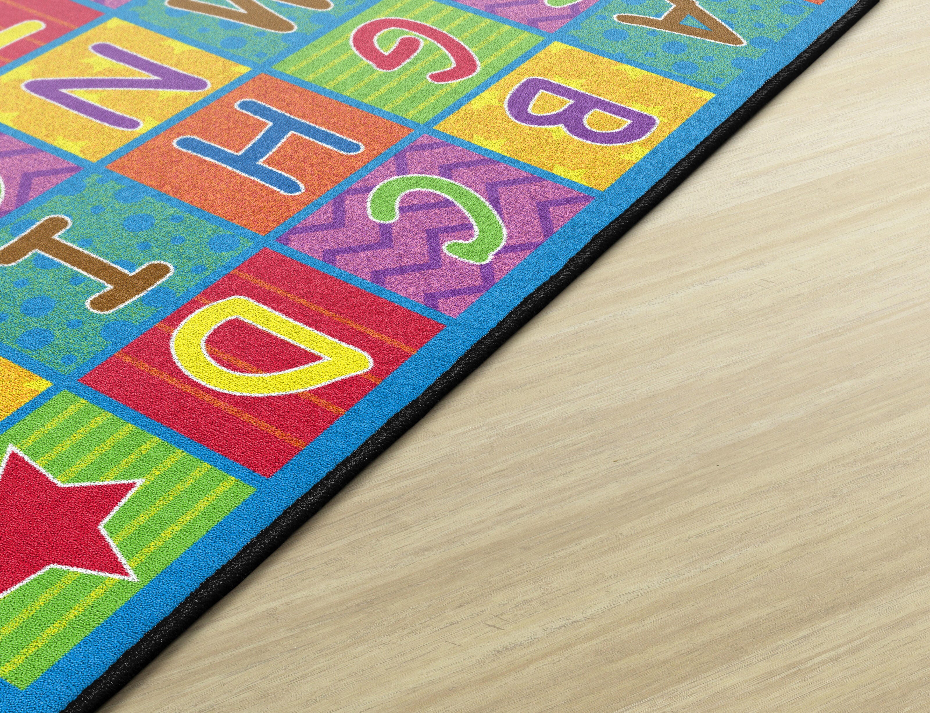 Flagship Carpets Cheerful Alphabet shows off the alphabet inches bright cheerful colors and playful patterns as well as providing organizational seating spaces.