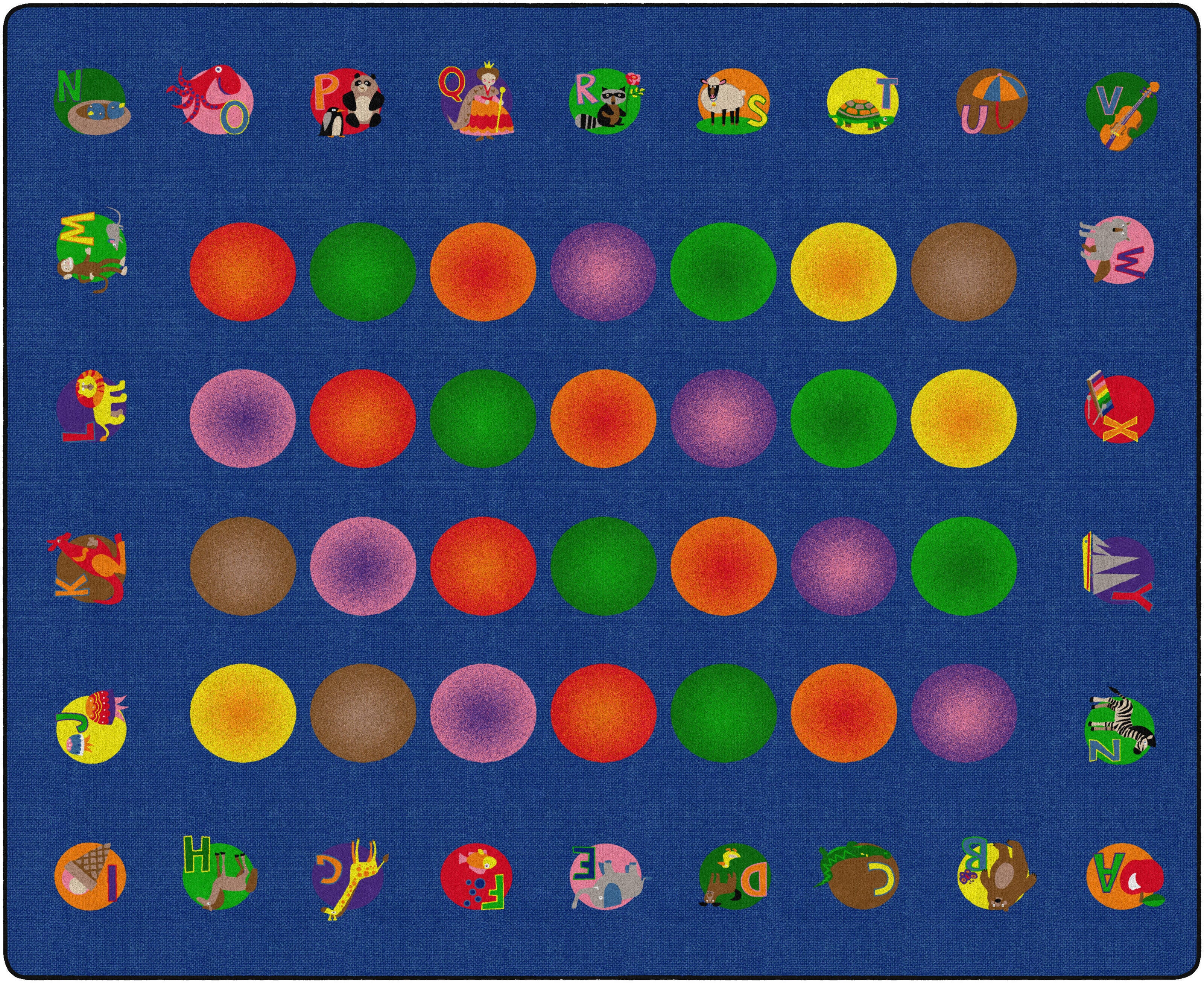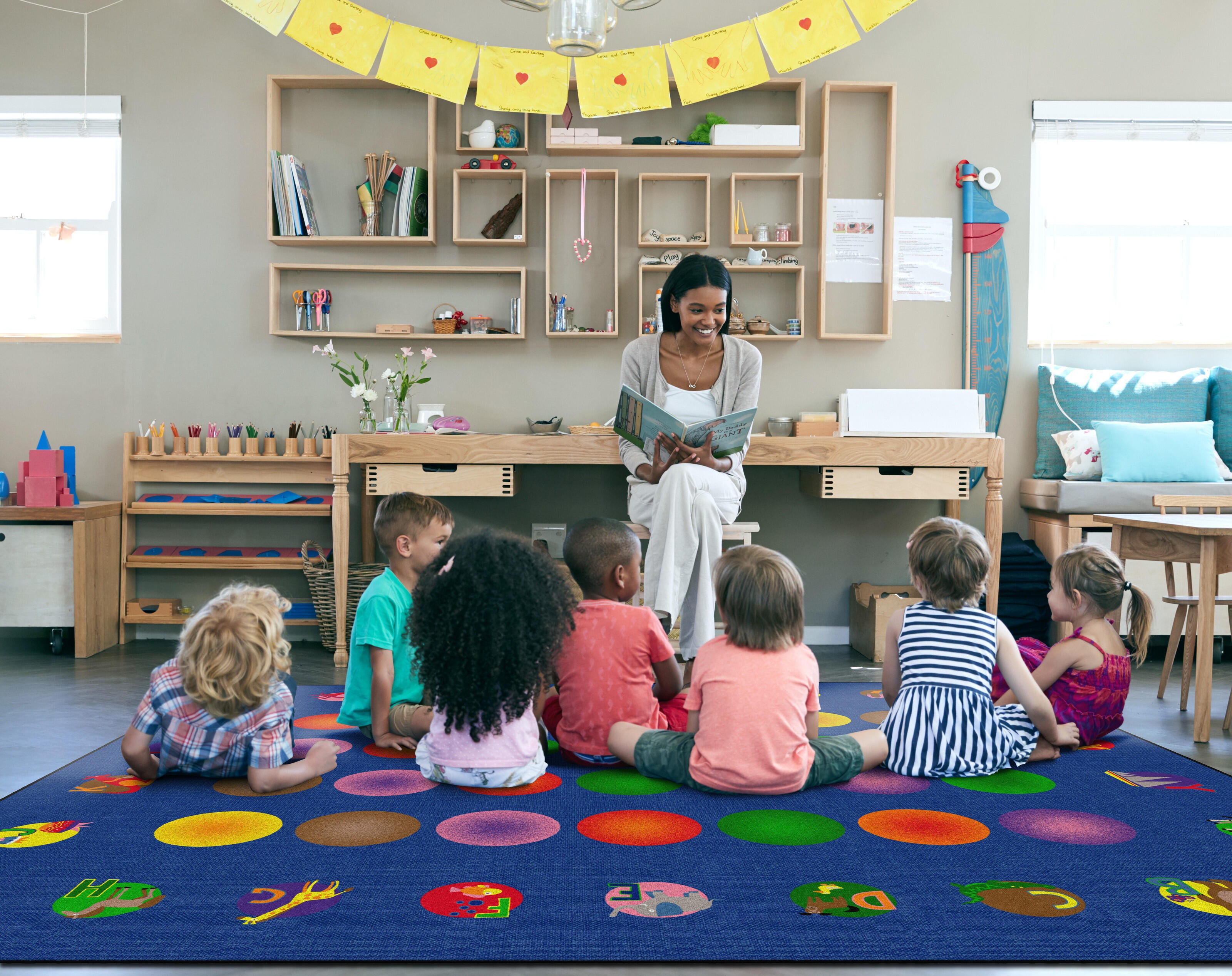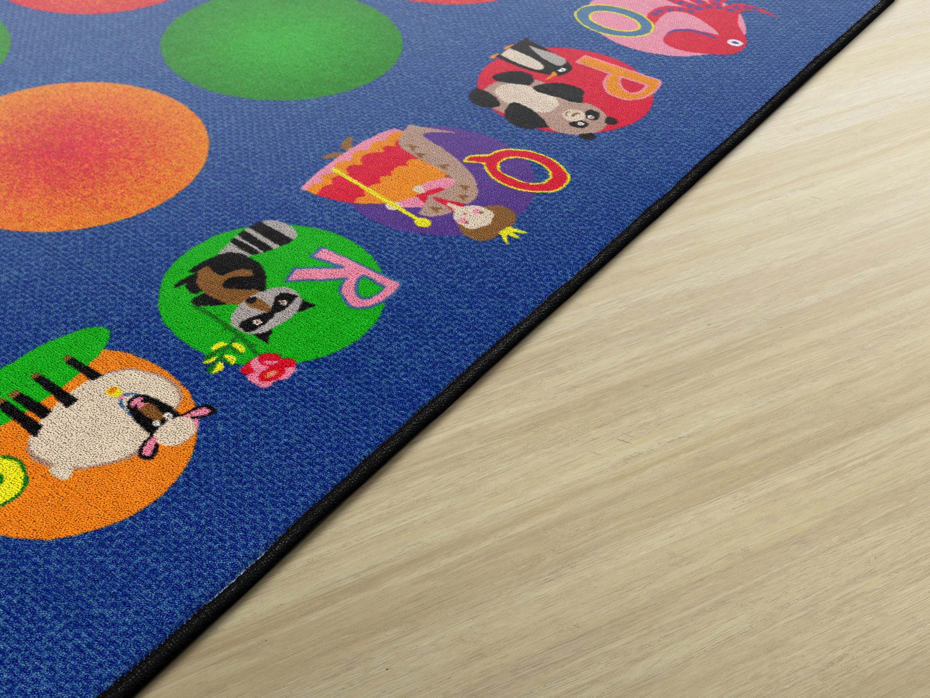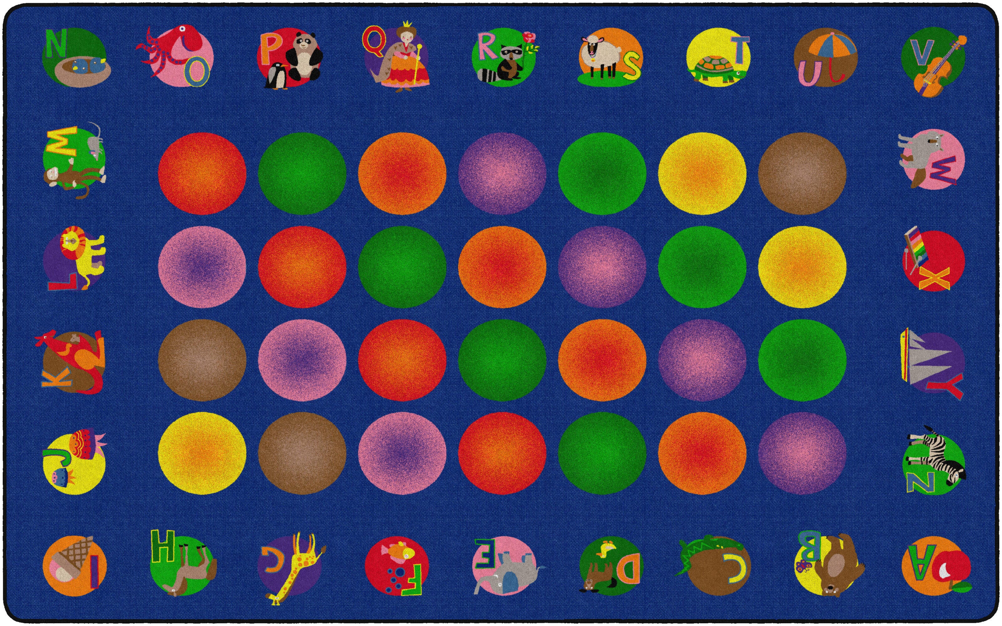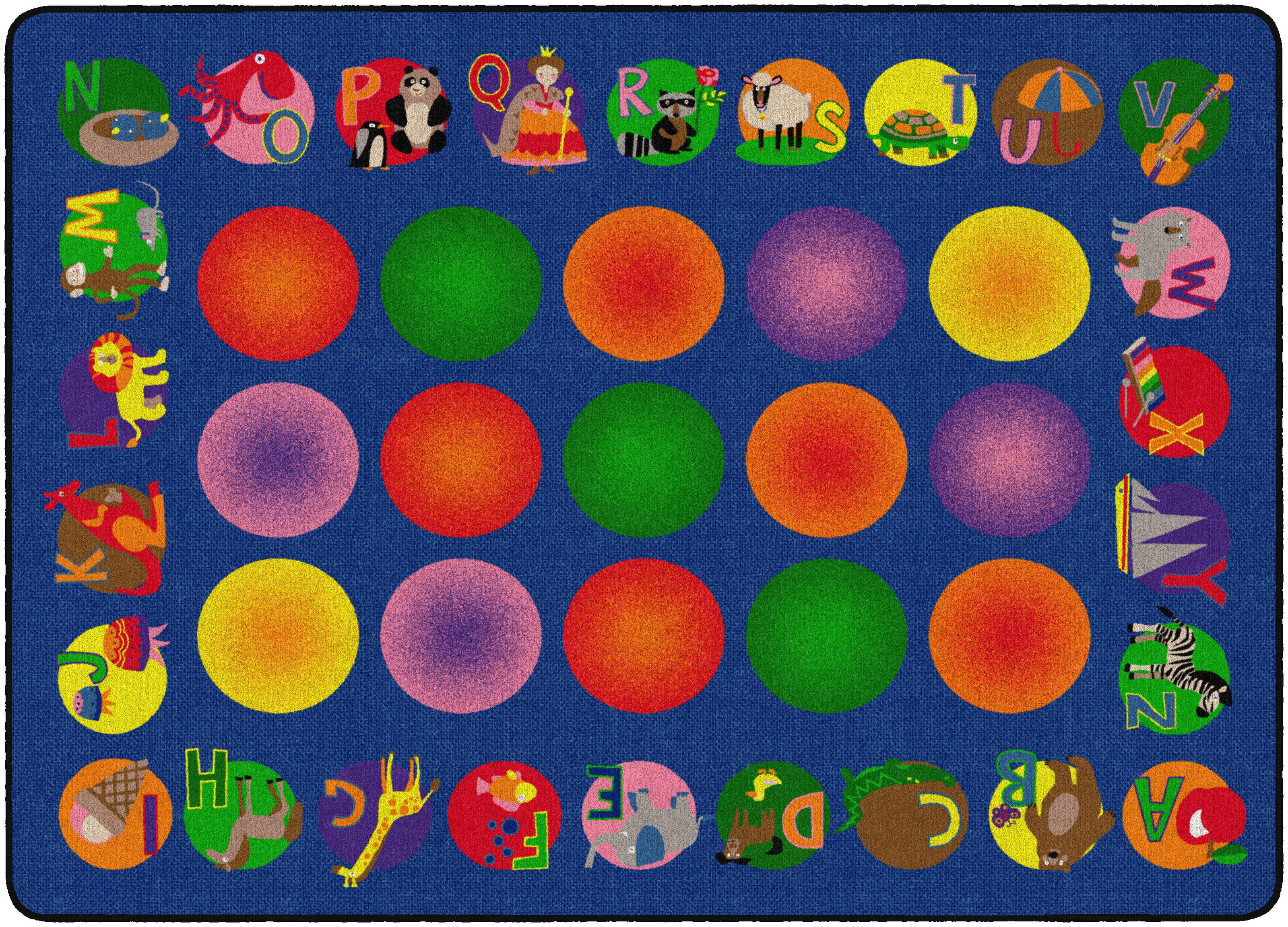 This colorful seating carpet makes story time and circle time fun with bright circles for each student to sit. Vibrant as an accent rug and functional as a mildew-resistant and stain-resistant classroom rug, this multifunctional design choice is built to last from year to year. Aids in letter recognition with a fun alphabet border paired with animal friends. This rectangle rug comes in a variety of sizes. Please select the size that best fits your space when ordering.