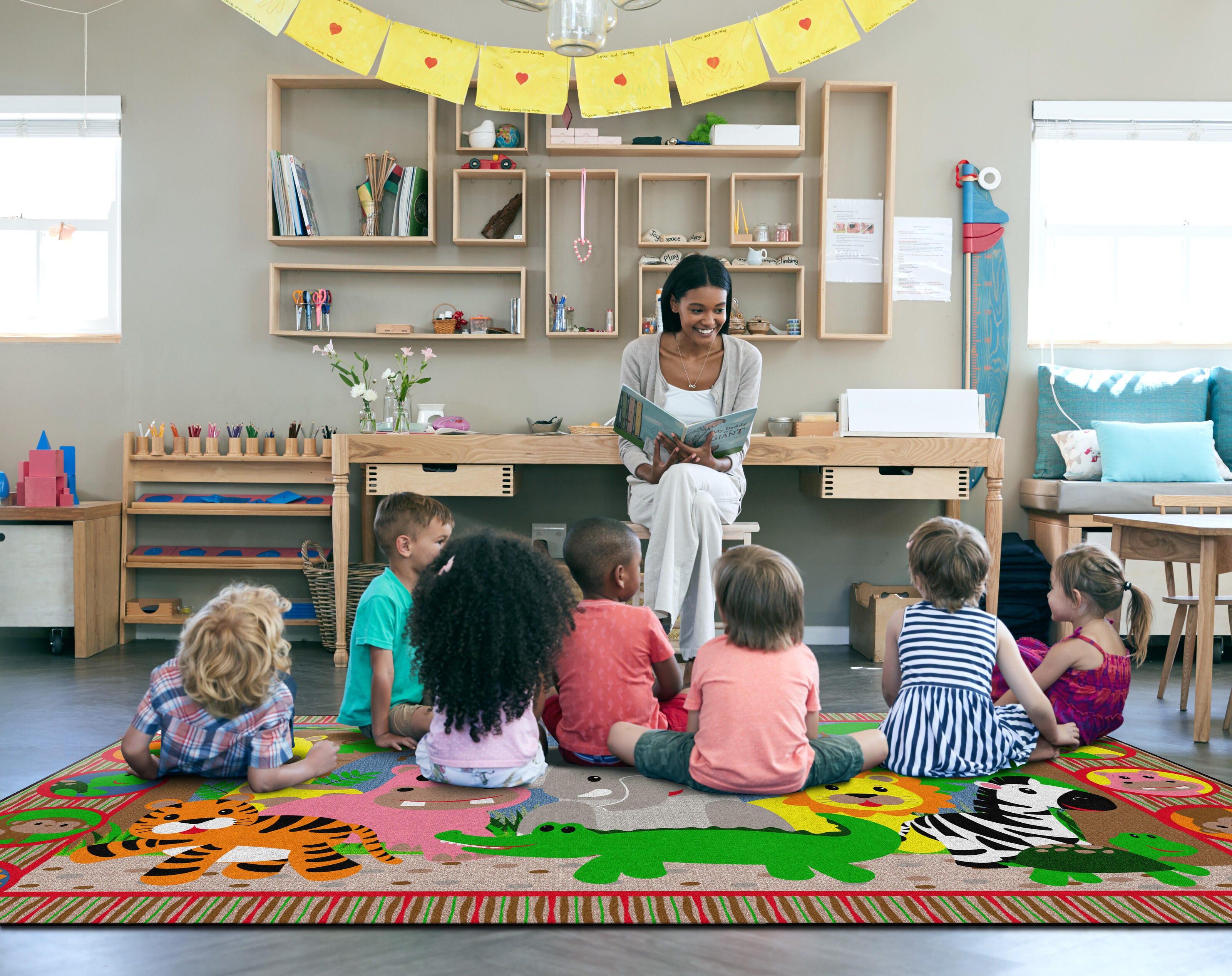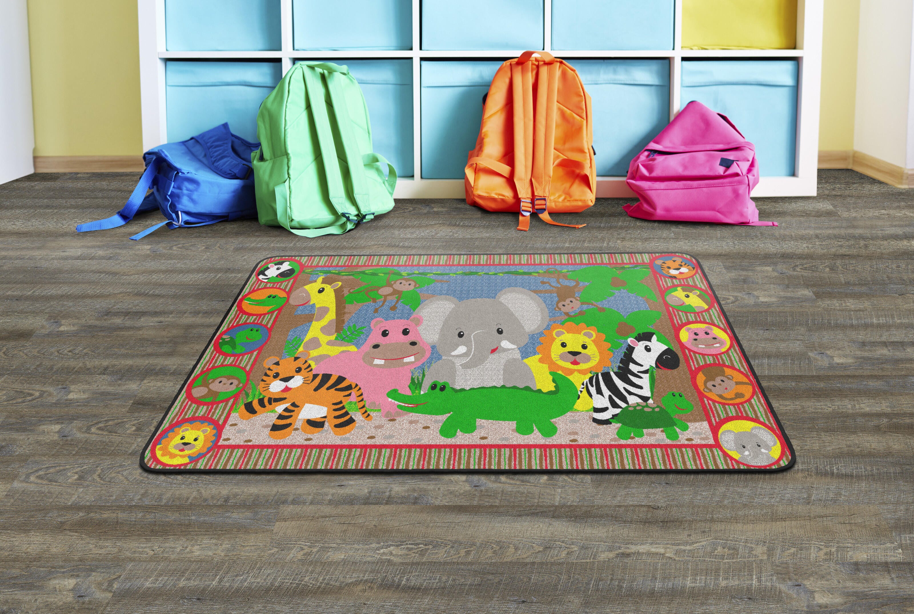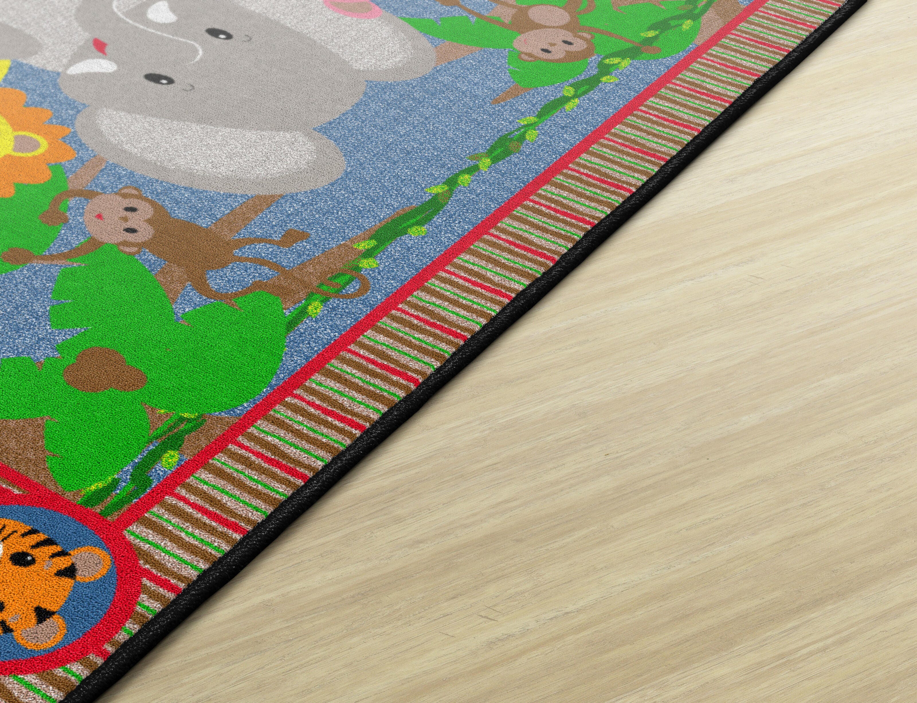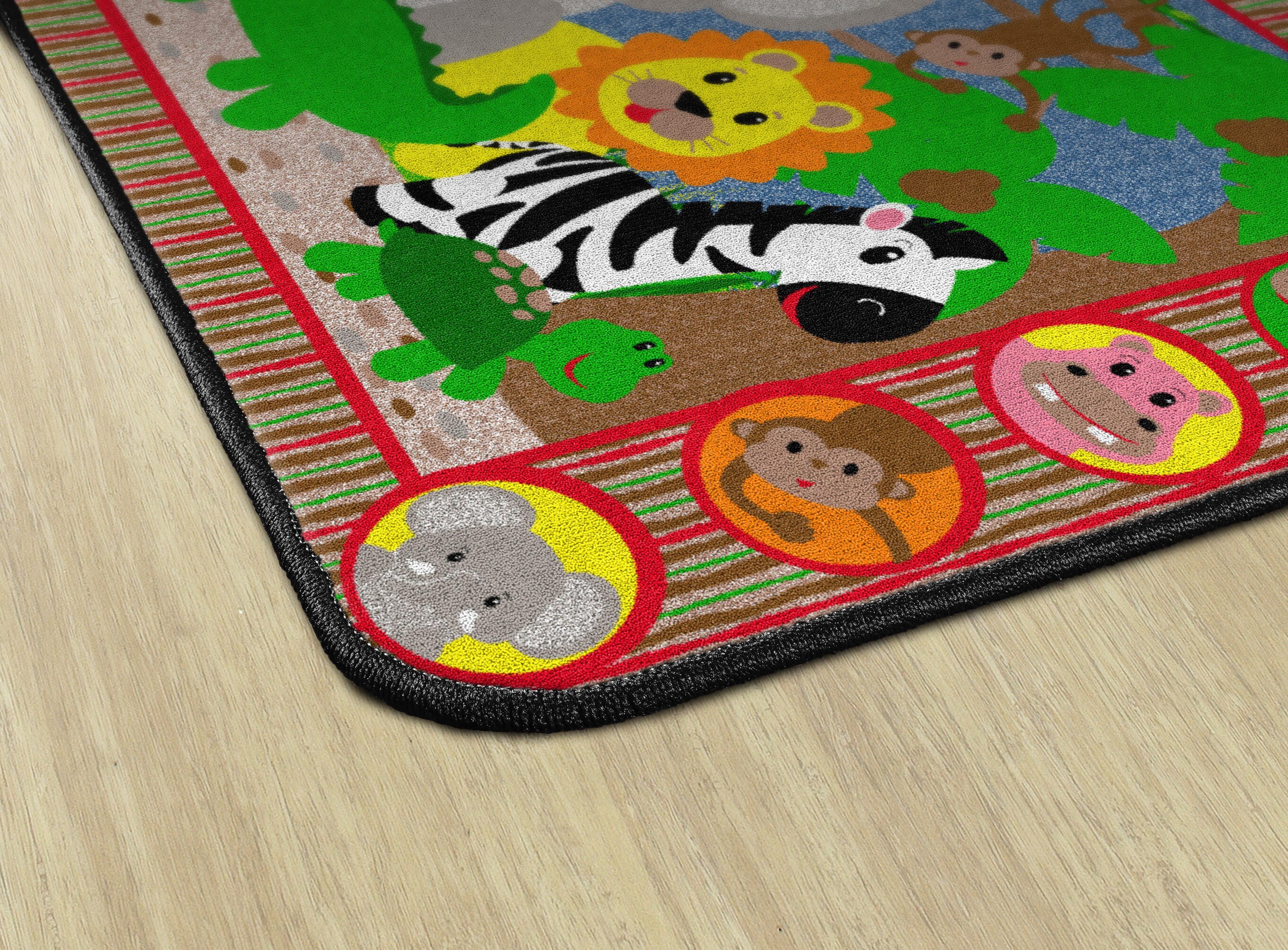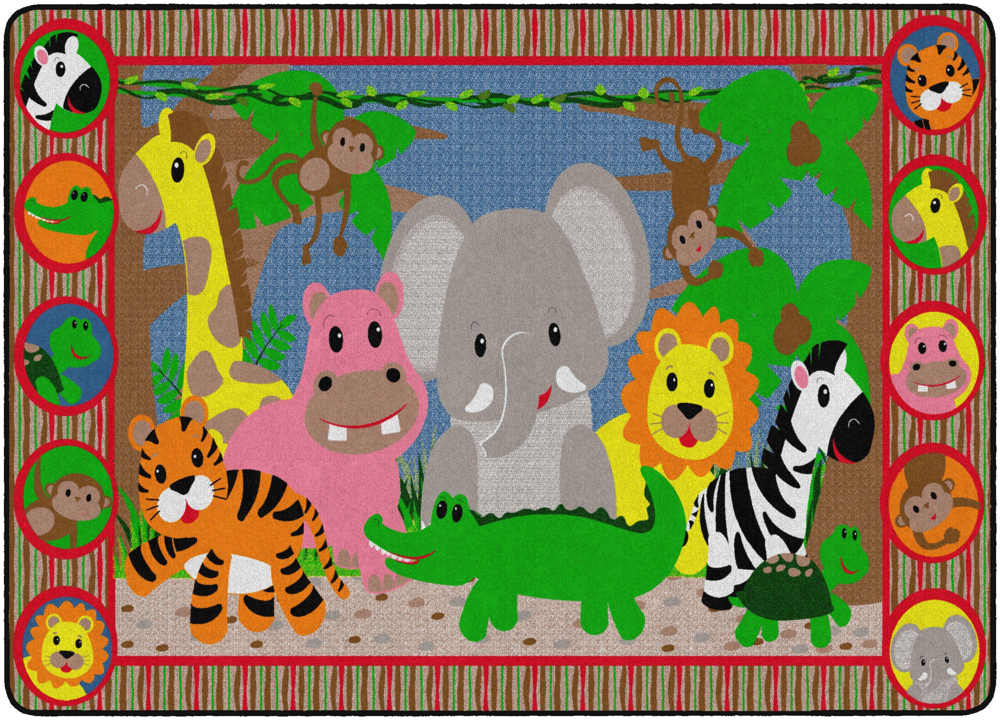 Explore the jungle from the comfort of your playroom. This seating carpet features smiling animal faces for friendly animal identification. This rectangle carpet is available in several sizes.