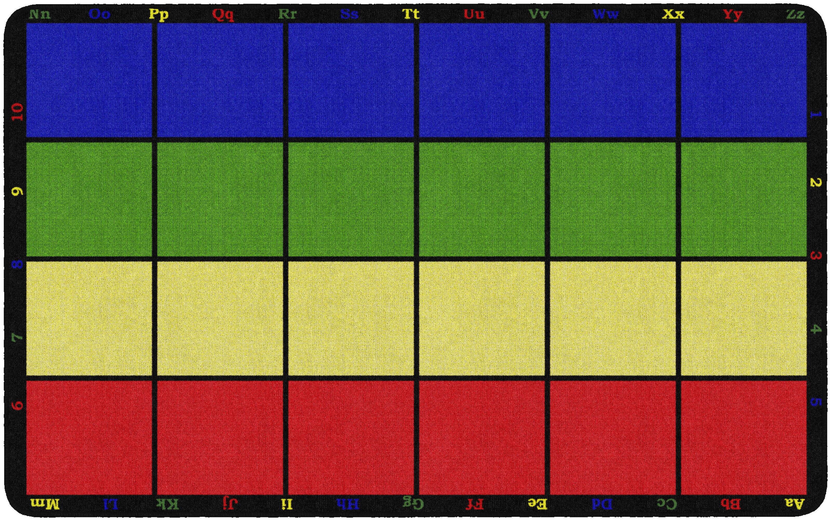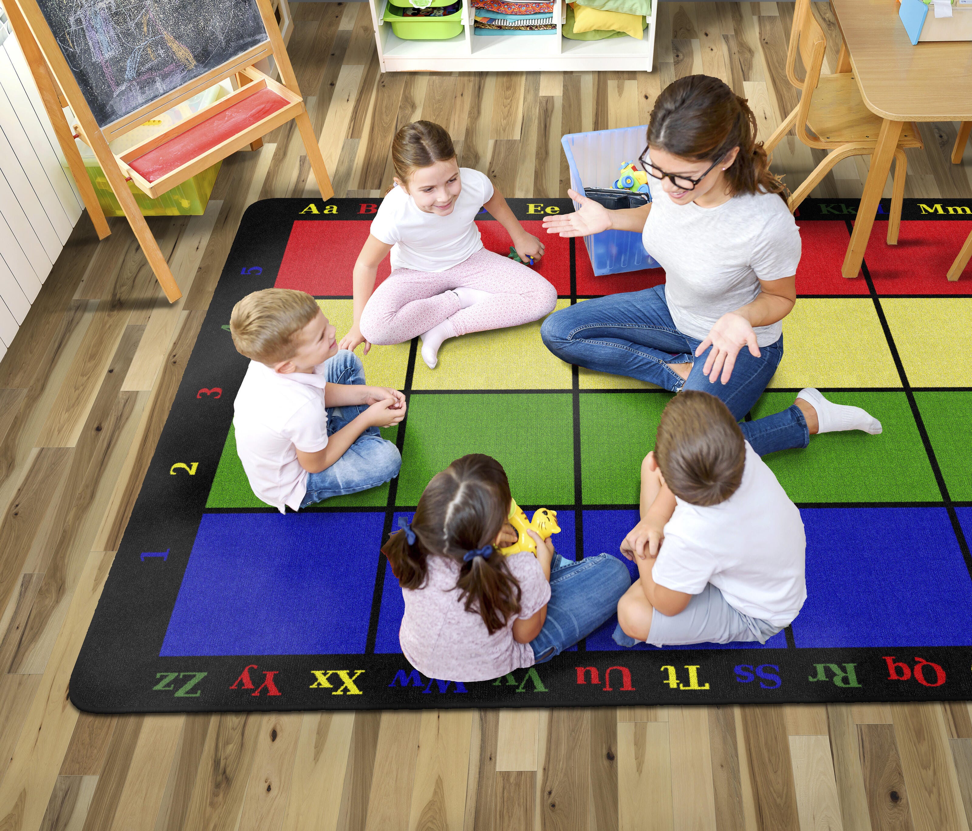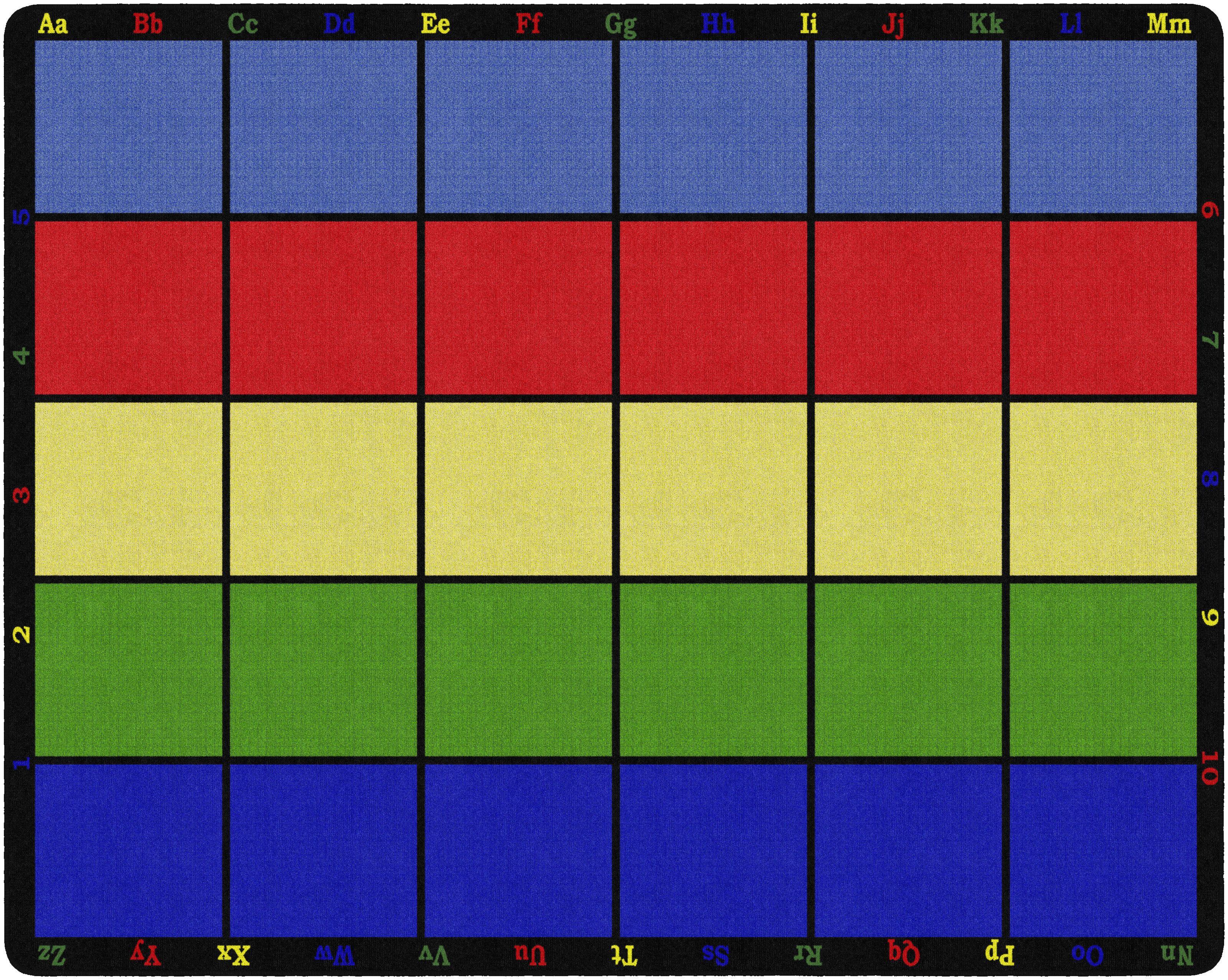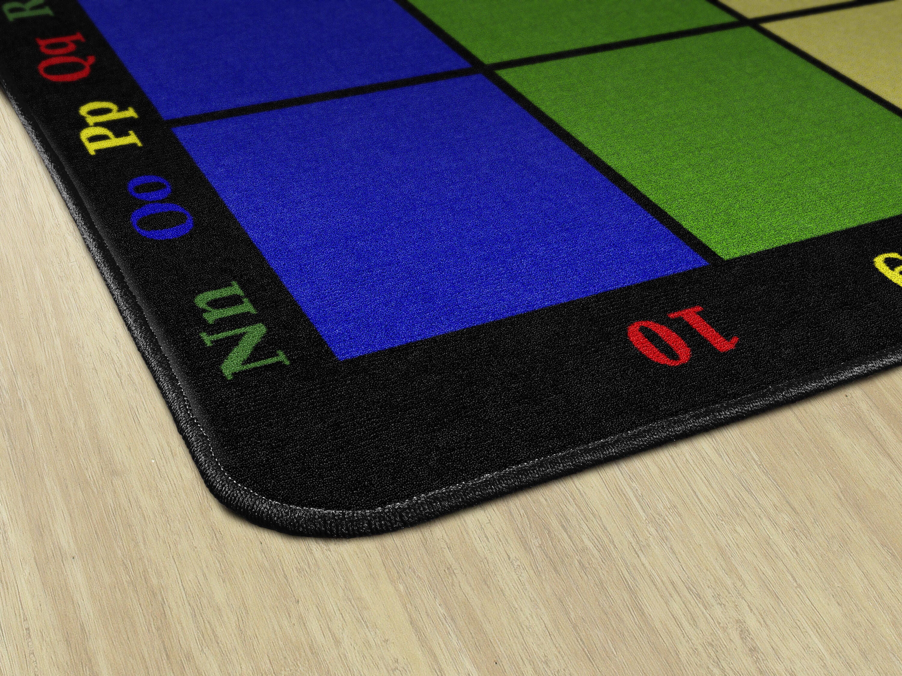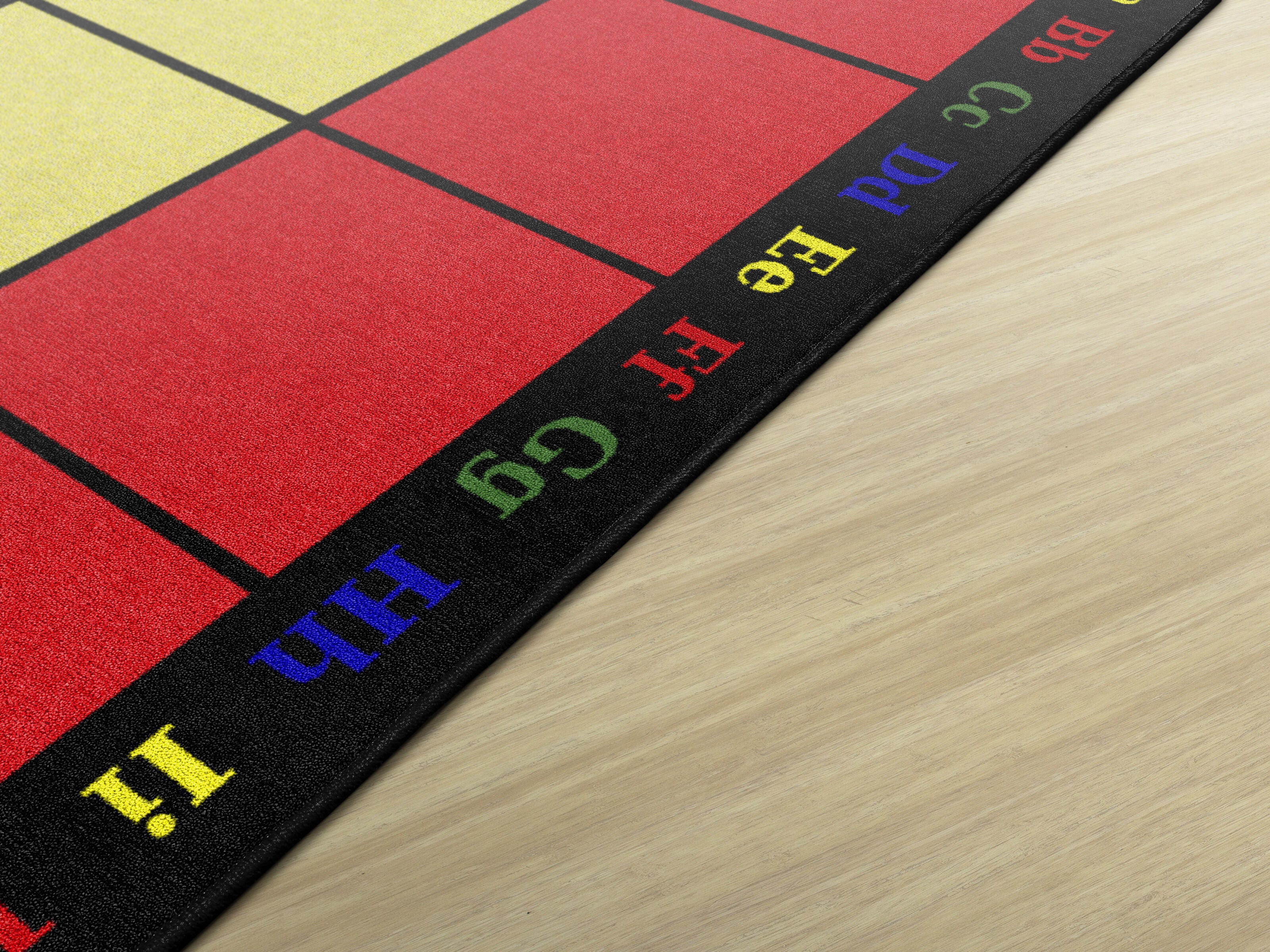 The Flagship Carpets Learning Grid Classroom Carpet has rows of colorful squares with the alphabet and numbers along the border. This area carpet can help children improve letter and number recognition with upper and lower case letters and numbers from 1 - 10 in bright primary colors. This colorful carpet is constructed of dense nylon fiber and treated with Scotchguard stain protection. The edges are tightly bound and double-stitched for maximum strength, and the skid-resistant Action Bac woven backing system prevents wrinkles and bunching so it provides long-lasting use. A permanent antimicrobial treatment protects against odors, mold, and mildew to keep it safe and clean in any classroom, preschool, childcare center, or home.