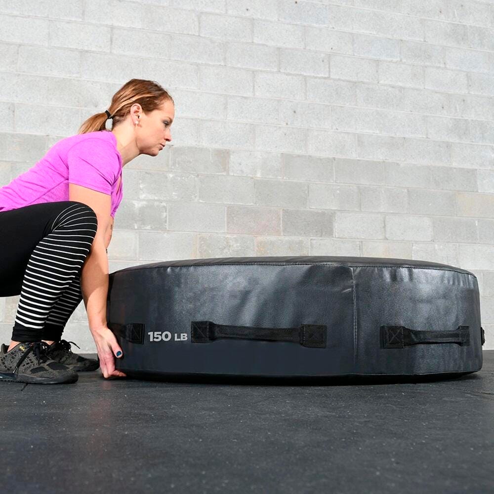 The 2-in-1 Flip and Plyo combines the benefits of a traditional plyo box while functioning as a tire that can be used for flipping, lifting and other functional training movements. Each plyo is approximately 46 inch diameter, each weight has varying heights. The 2-in-1 Flip and Plyo is unlike a traditional tire as it is a flat, smooth platform suitable for users at any fitness level. It also has has reinforced grips around the outer edge, allowing for various partner training exercises and ease of carrying.