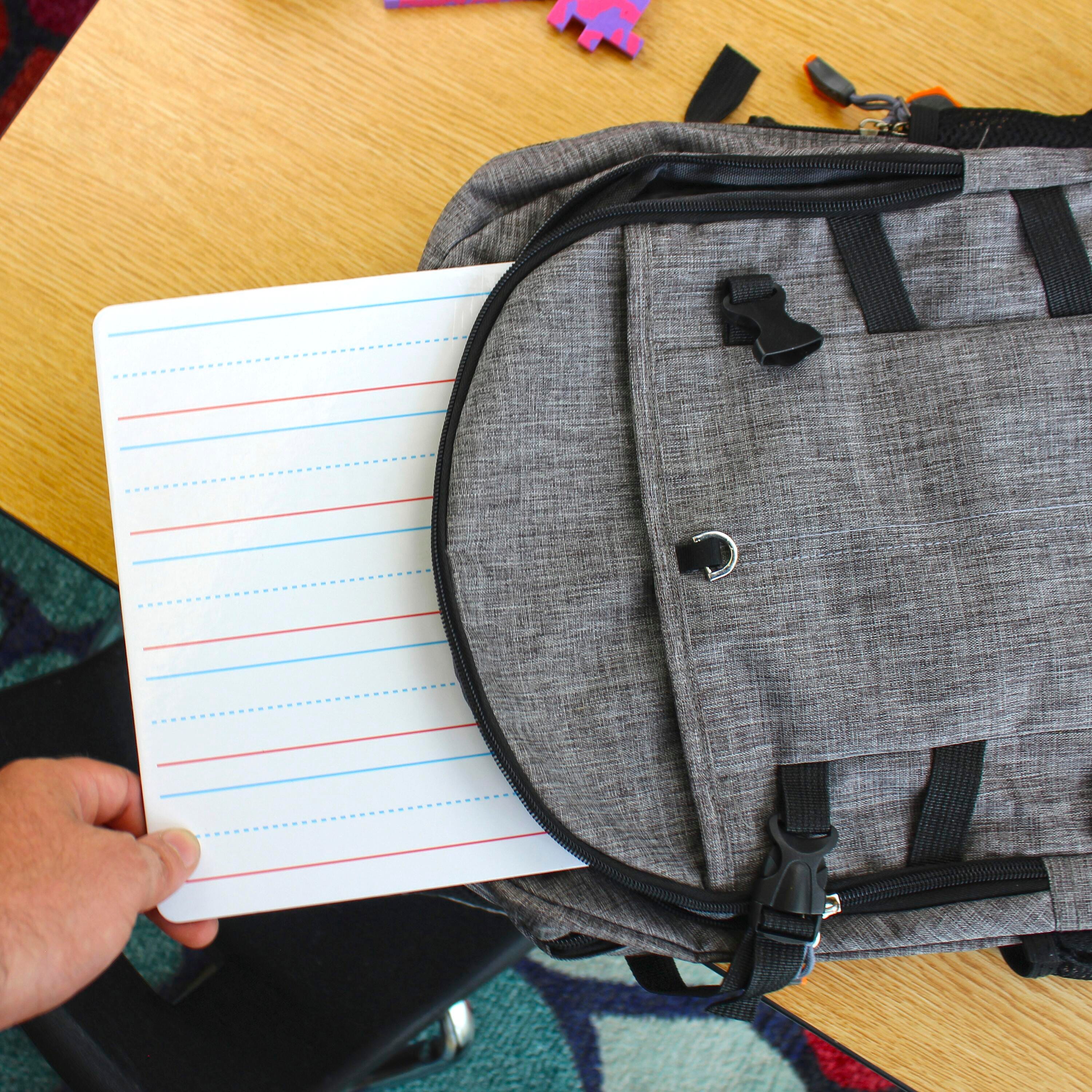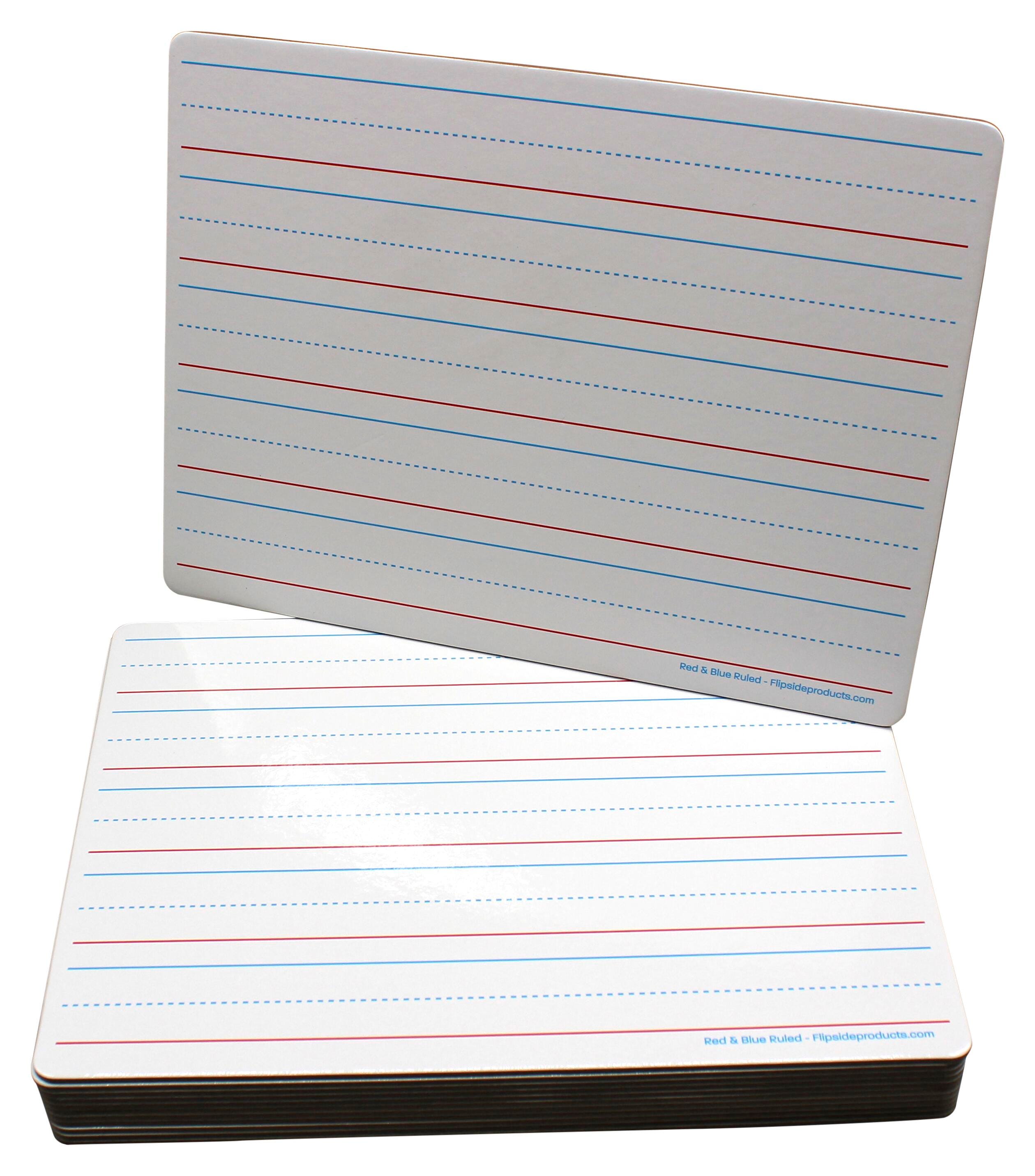 Learning to write takes practice, practice, practice. This Flipside set includes 12 margin-ruled dry erase boards featuring one blank side and one side with margin-ruled red/blue lines for handwriting exercises and games. Each 9 x 12 inch board is sized to sit on a desk or a lap to get your students feeling in engaged and on their way to mastering handwriting quickly. Quality write-and-wipe whiteboard surface is non-ghosting. Markers and erasers are included for convenient use for groups or class work.Features