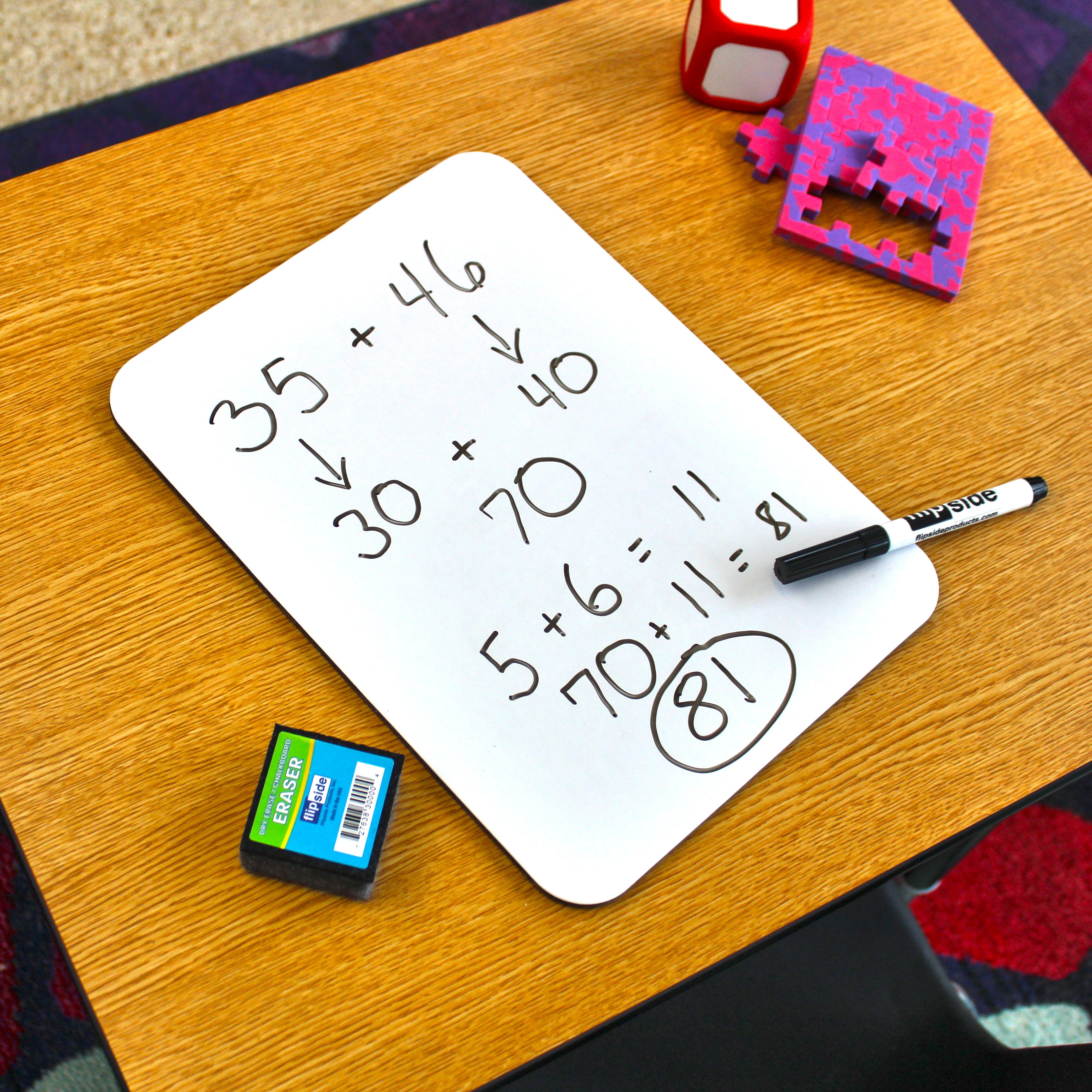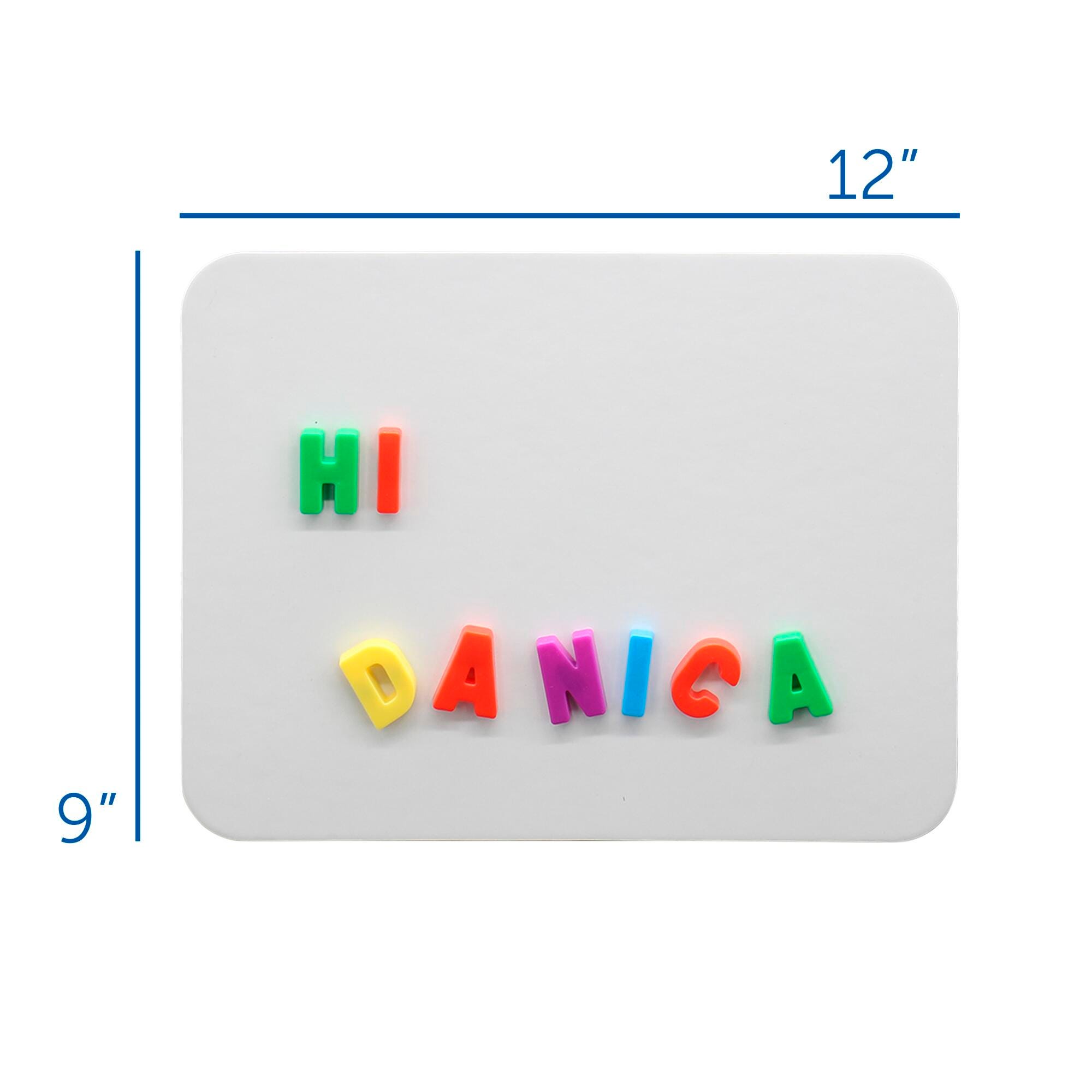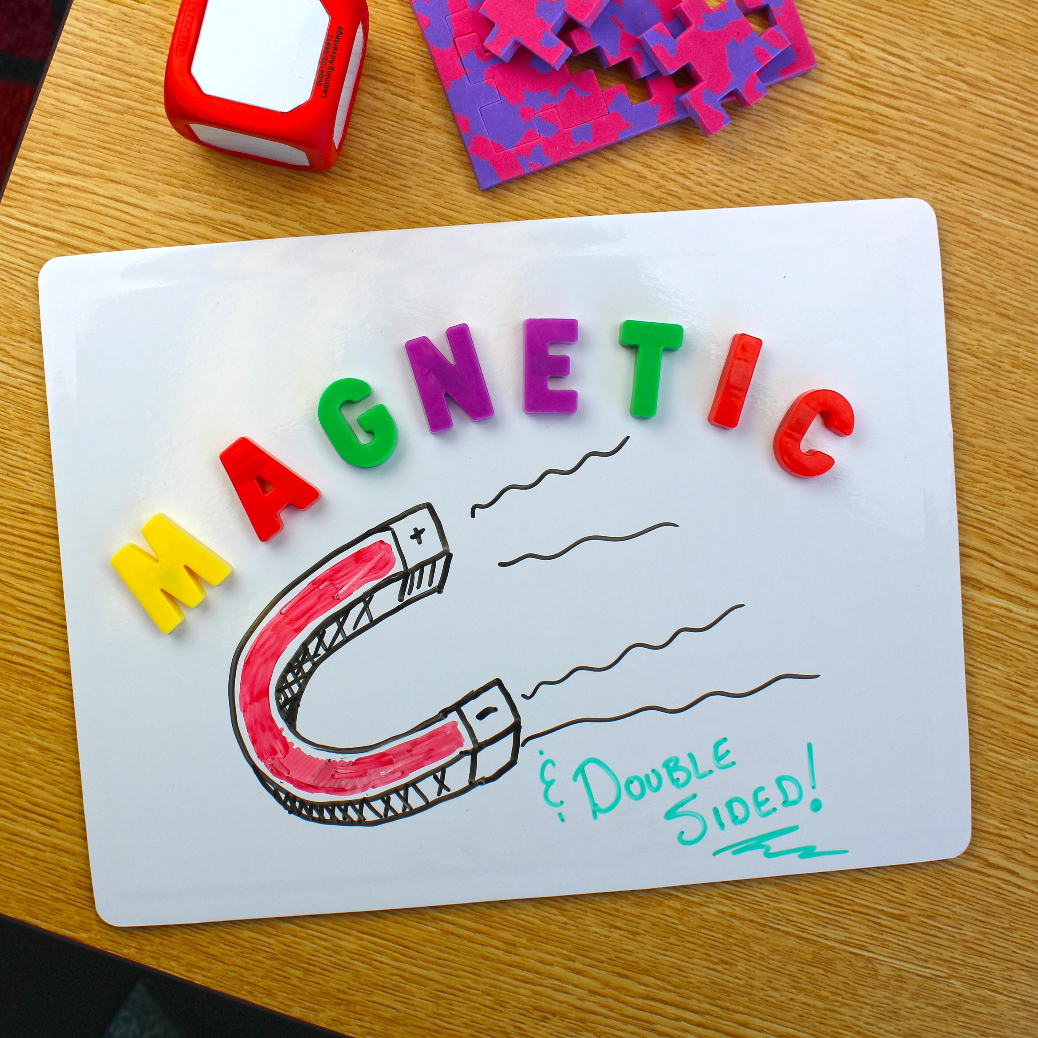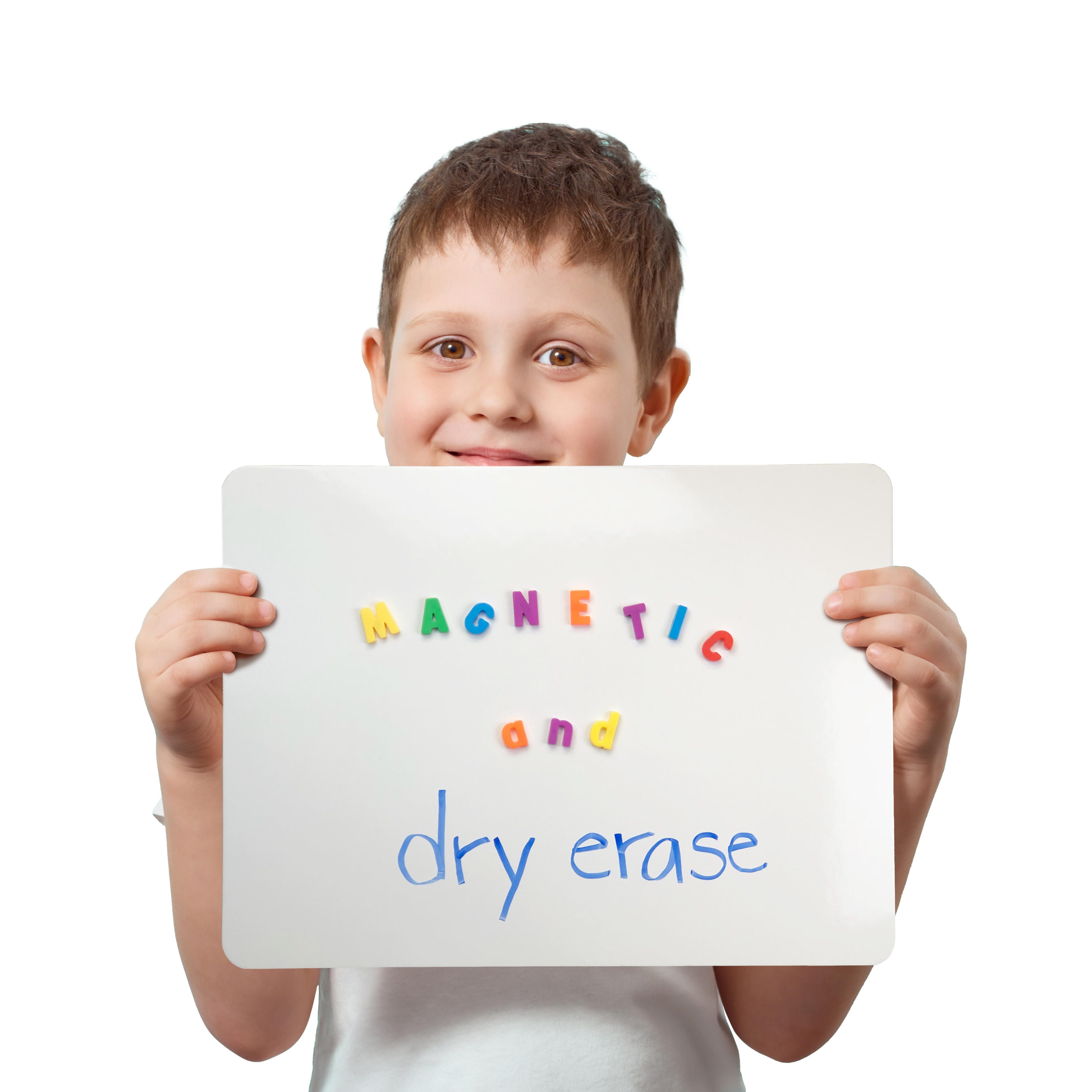 Economical, unframed lap board with magnetic-receptive plain dry erase surface is ideal for academic practice, doodling, and for use with magnetic manipulatives. Quality write-and-wipe surface is non-ghosting. Rounded corners for safety and comfort. Backing is warp and chip resistant. Boards measure 9 x 12 x 0.13 inches.