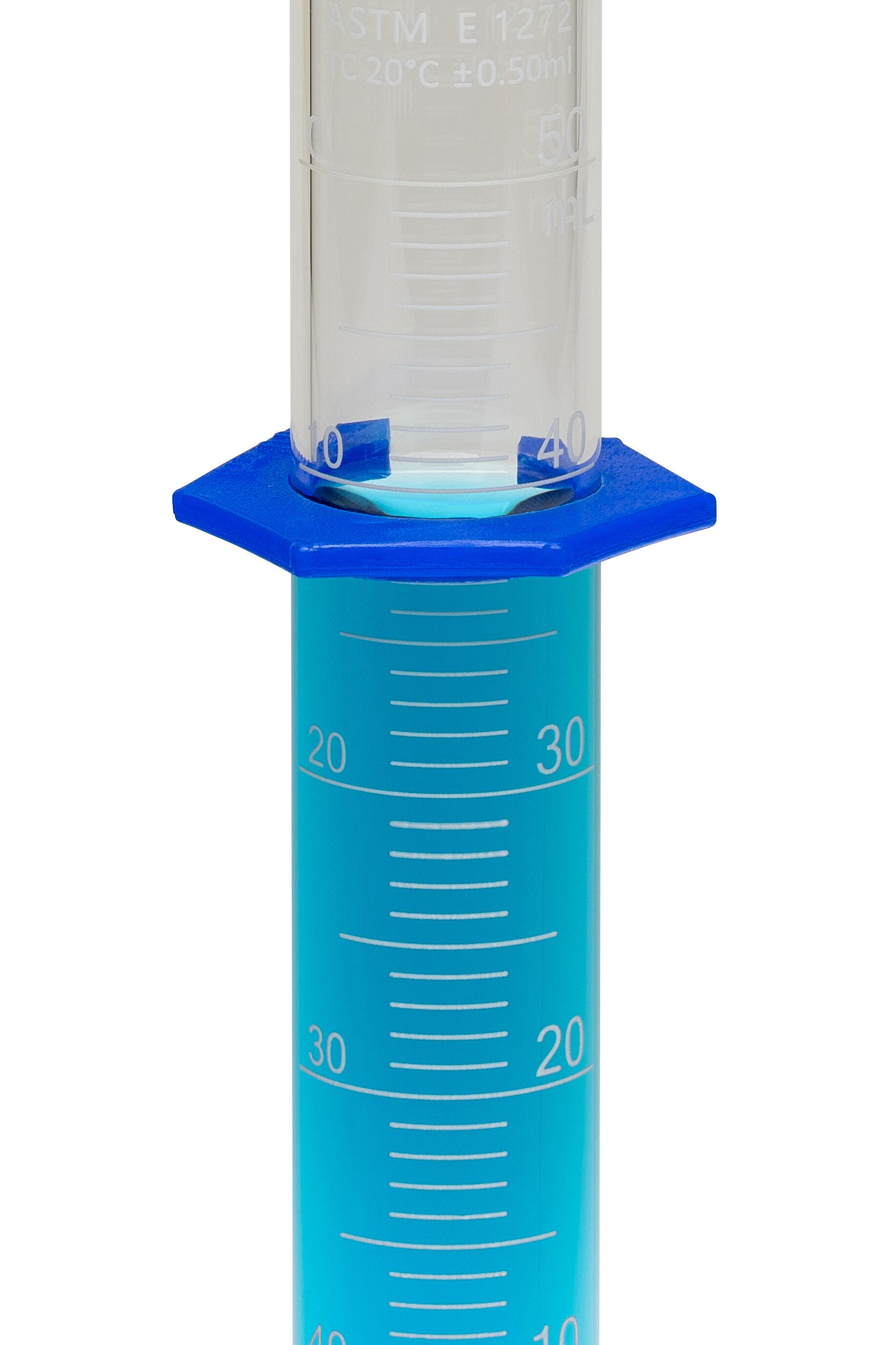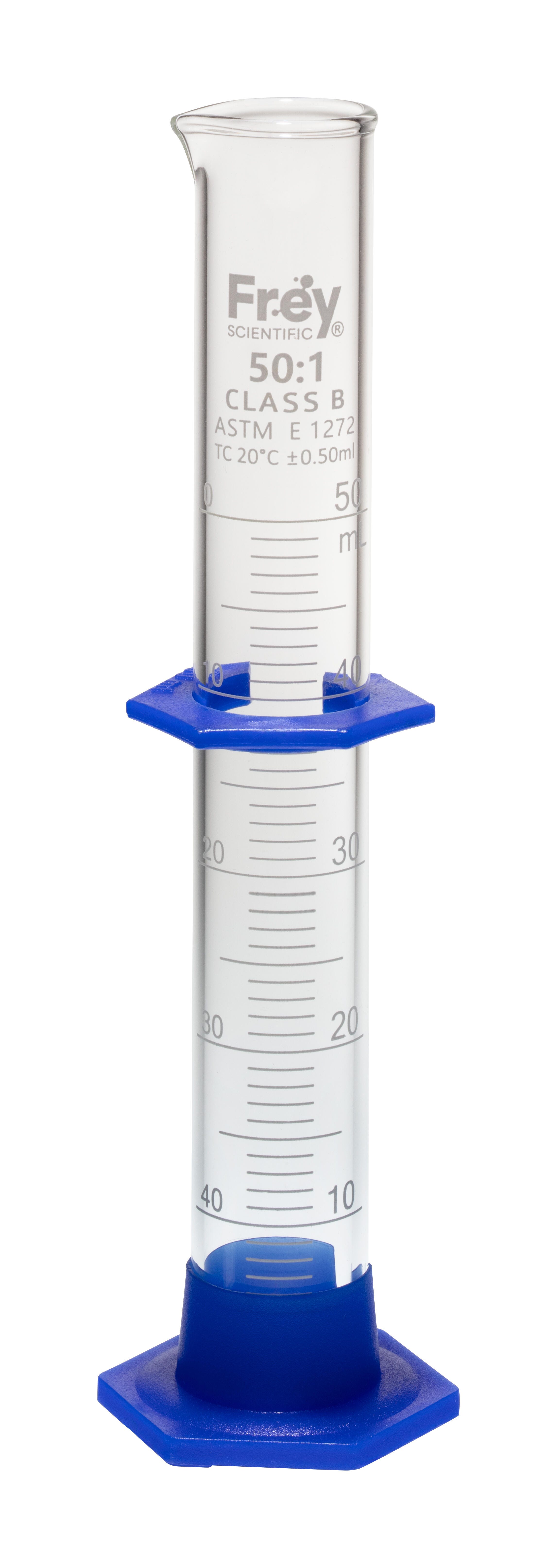 This pack of graduated cylinders from Frey Scientific complies with ASTM E1272, Class B standards for general-purpose lab use. Each cylinder is calibrated to contain and has a double metric scale, a 50 mL capacity, and 1 mL graduations. The borosilicate glass cylinders feature a pour spout, heavy uniform wall tubing, and a hexagonal plastic base. They include bumper guards to prevent accidental breakage.Features