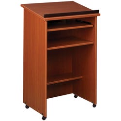 The sloped top keeps papers and items at the right angle for reading, and the retaining edge keeps papers from sliding off. A pullout keyboard tray and a sturdy shelf, make this podium versatile. Other features include specially designed dual wheel casters than can easily roll over uneven floors and threshold, making it easy to go from one area to the next. Measures 26 W x 23 D x 42 H inches.