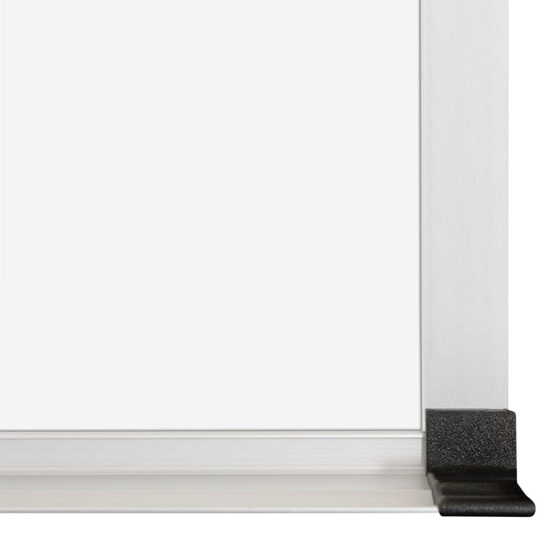 Magnetic porcelain steel markerboard is engineered for superior color contrast with dry erase markers. Standard gloss, dry erase surface, provides superior writability and erasability with no ghosting. Reduced surface light distortion enhances visibility to provide optimum eye comfort. Steel is permanently laminated to a light weight substrate for stability and durability. It has an anodized aluminum abc trim has a 7/8 inch profile with hairline mitered corners. Top corners are protected with aluminum end caps. Full-length accessory tray includes plastic end caps to eliminate sharp corners.