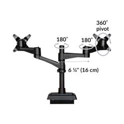 For spaces low on space with heavy work demands, meet the VARI Dual-Monitor Arm designed to swivel two monitors up to 180 degrees. This classic black design is made to blend with your current tech space's aesthetic while providing a dynamic solution to small work spaces like computer labs, cubicles, or high-tech educational spaces.
