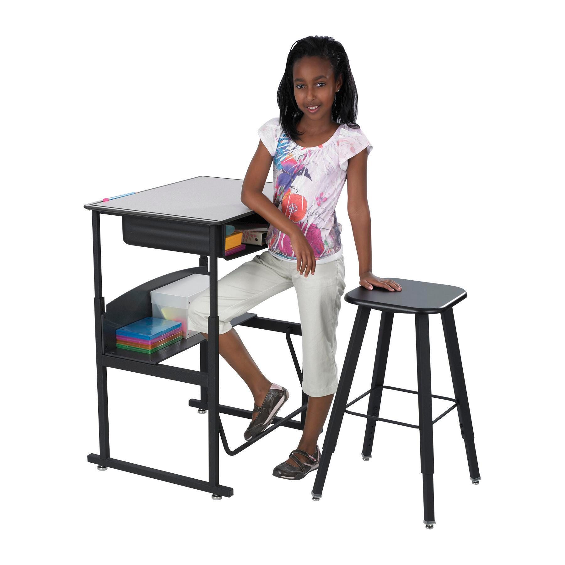 Adjustable height stand-up student desk with swinging footrest helps improve posture and focus.