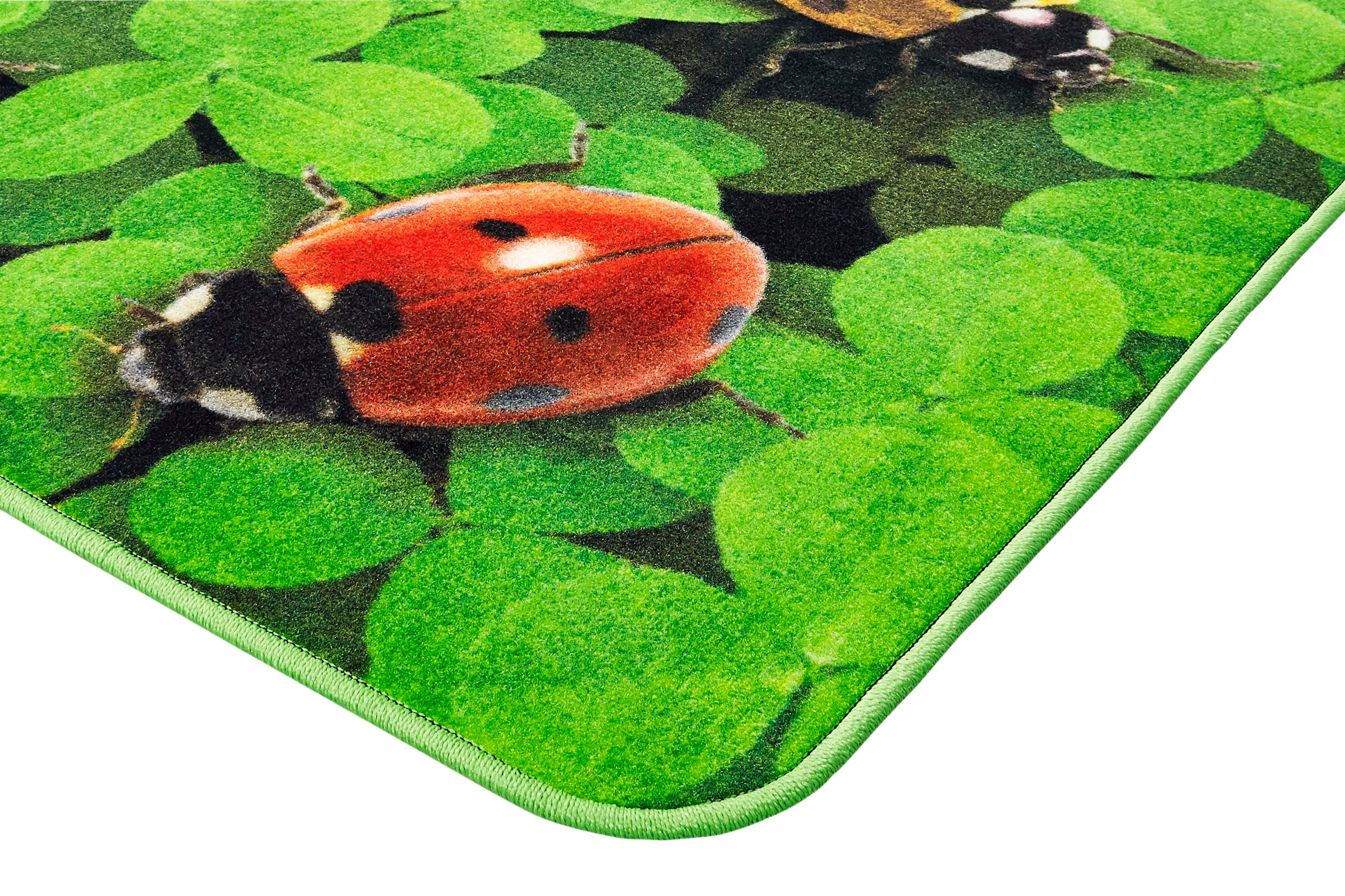 Take a seat on a calming pattern of clover and photos of brightly colored red and yellow ladybugs. This rectangle carpet features photo-real design and is available in several sizes.