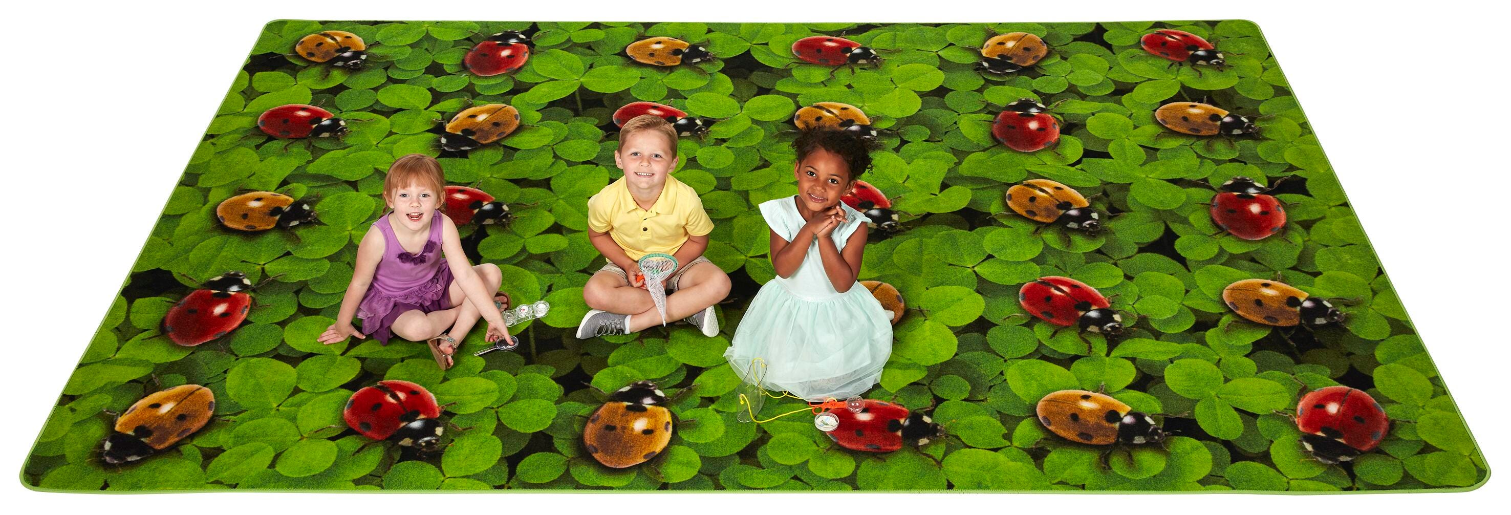 Bring nature indoors without the mess with this classroom carpet featuring photo-real ladybugs and clovers. The perfect addition to playrooms, preschools, and classrooms, this floor covering is stain-resistant to stay bright and vibrant even in high-traffic areas. Comfortable as a seating carpet for storytime and circle time, bright as an area rug to decorate your playful space. This rectangle rug will bring smiles and color to any classroom. Available in several sizes to best match your space. Please select the size that best fits your space when ordering.