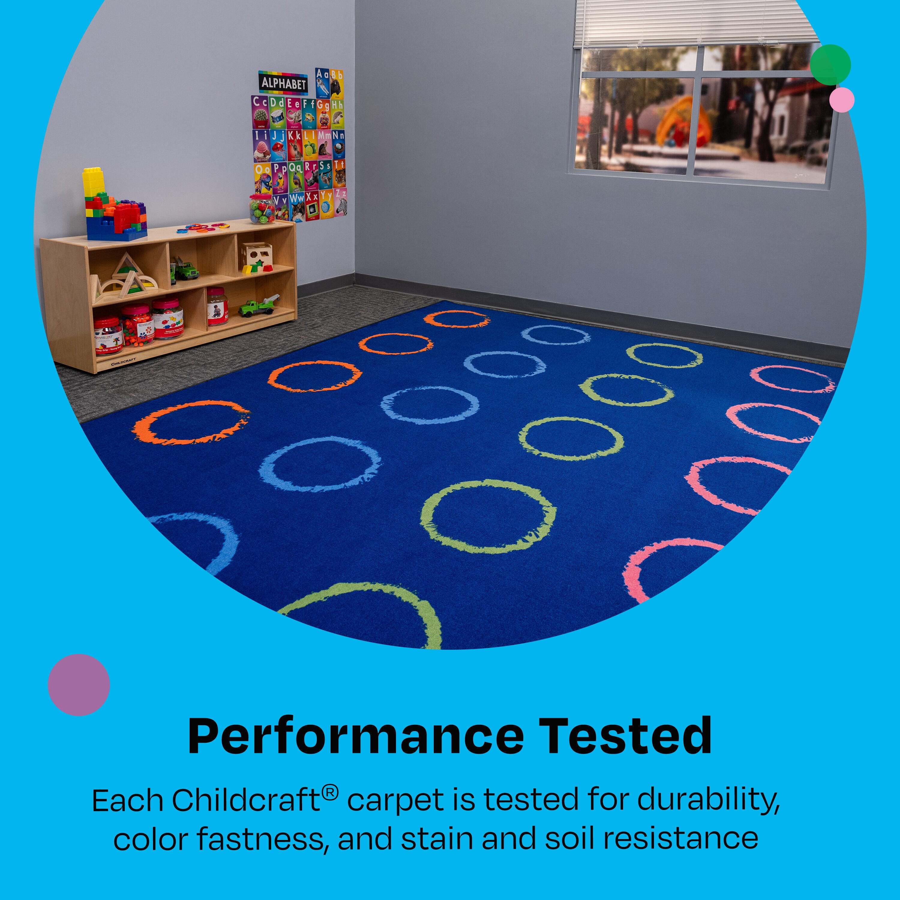 Learning hits the spot! This seating carpet features whimsical, brightly-colored chalk spots that are perfect for story time, games, classroom activities, morning attendance, and more. A Green Label Plus certification also ensures the best indoor quality for a safe and healthy environment all year long. Every Childcraft carpet is performance tested for durability, color fastness, and stain and soil resistance for quality you can trust.