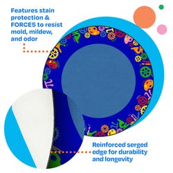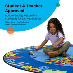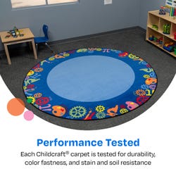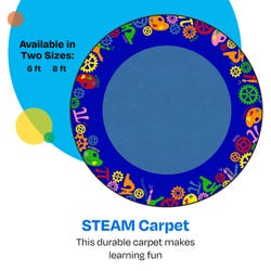 Childcraft® STEAM Carpet for Classrooms is a vibrant and educational addition to any learning environment. This round-shaped carpet showcases colorful images representing STEAM (science, technology, engineering, arts, and math), sparking curiosity and encouraging critical thinking. Perfect as a seating carpet for group activities or as a standout accent piece, this carpet combines comfort, durability, and design to create an engaging space. Each Childcraft carpet is performance tested for durability, color fastness, and stain and soil resistance for quality you can trust.Features