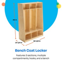 Childcraft Bench Coat Locker, 3 Sections, Wooden, 32-1/2 x 14-1/4 x 48 Inches