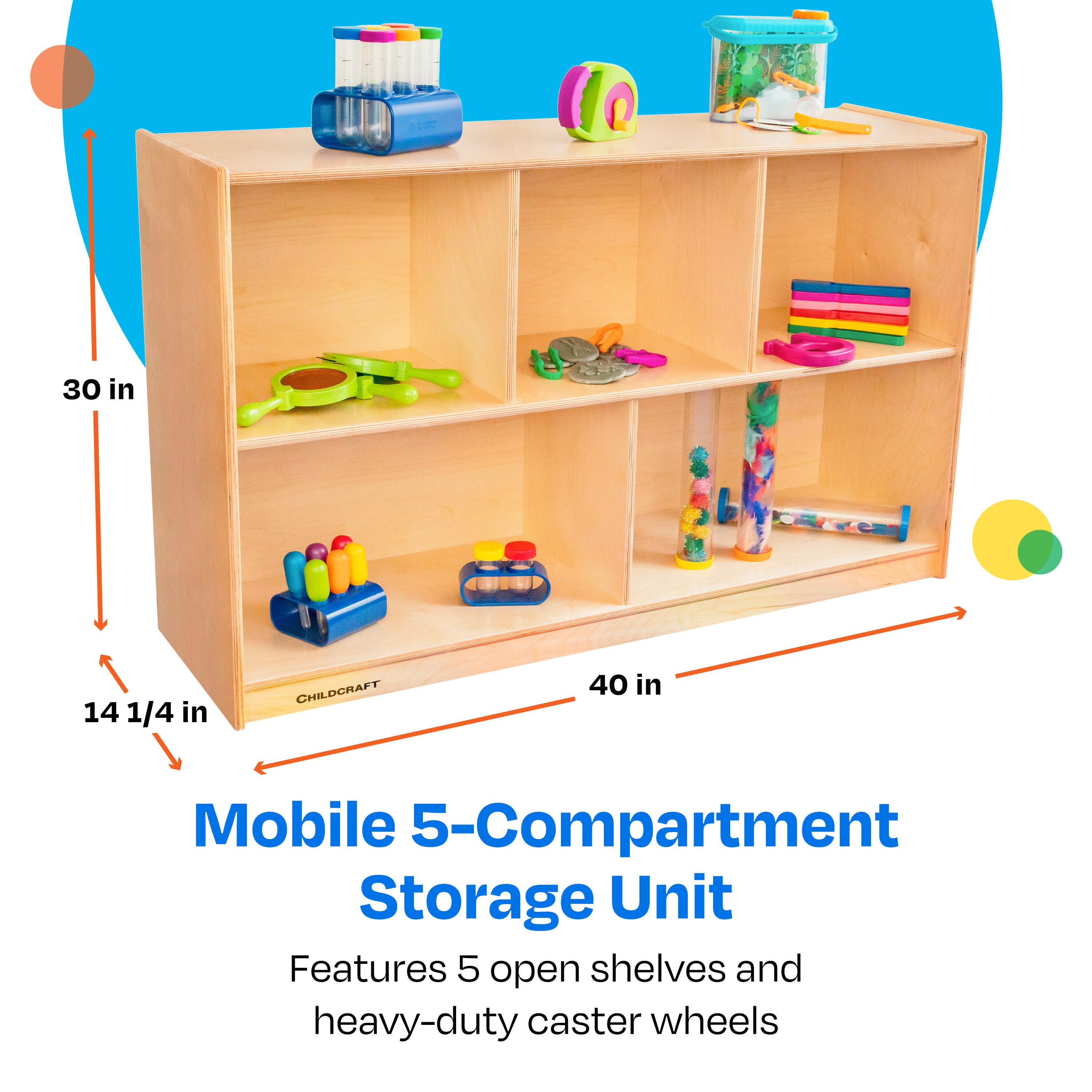 Childcraft® Mobile 5-Compartment Storage Unit for Classrooms is easy to assemble and made with a durable design. Use the wooden shelf on wheels for preschool, kindergarten, daycare centers, homes, and beyond. The convenient storage shelves are great for storing and organizing books, blocks, games, toys, and manipulatives, keeping them neat and accessible for students. Crafted for long-lasting use, this classroom furniture piece is made of durable birch plywood that’s easy to wipe clean. Comes fully assembled. This item comes with a Limited Lifetime Warranty.