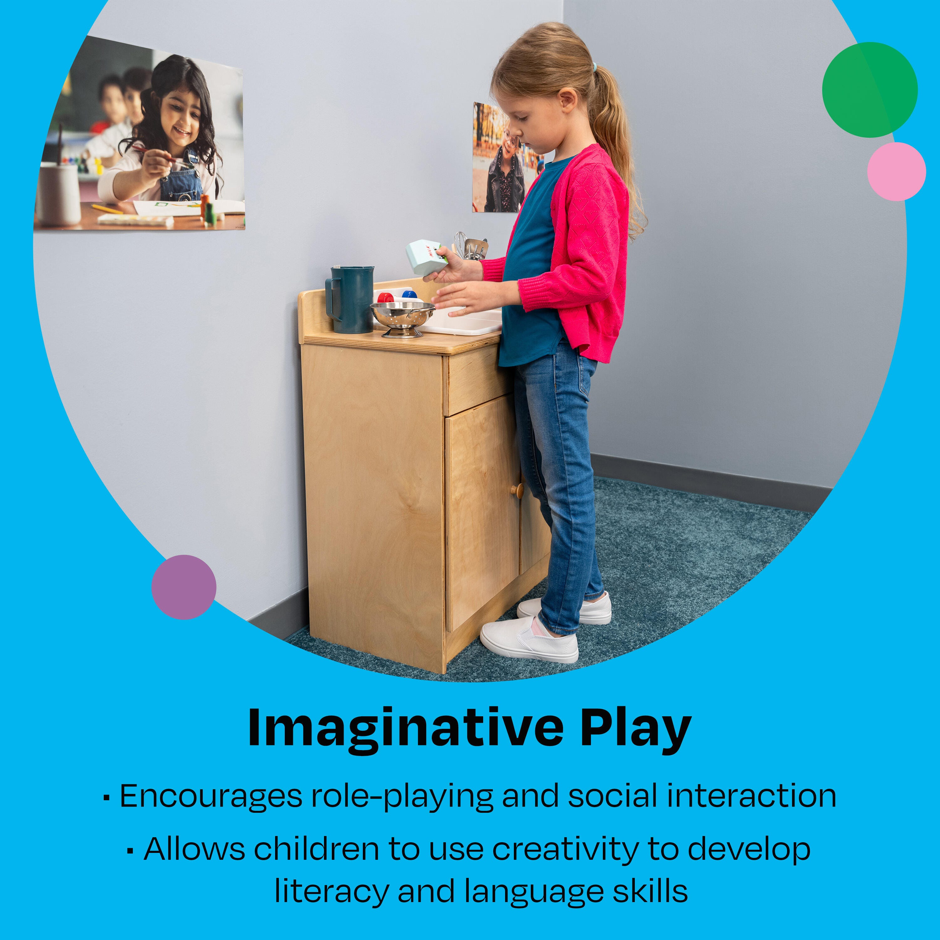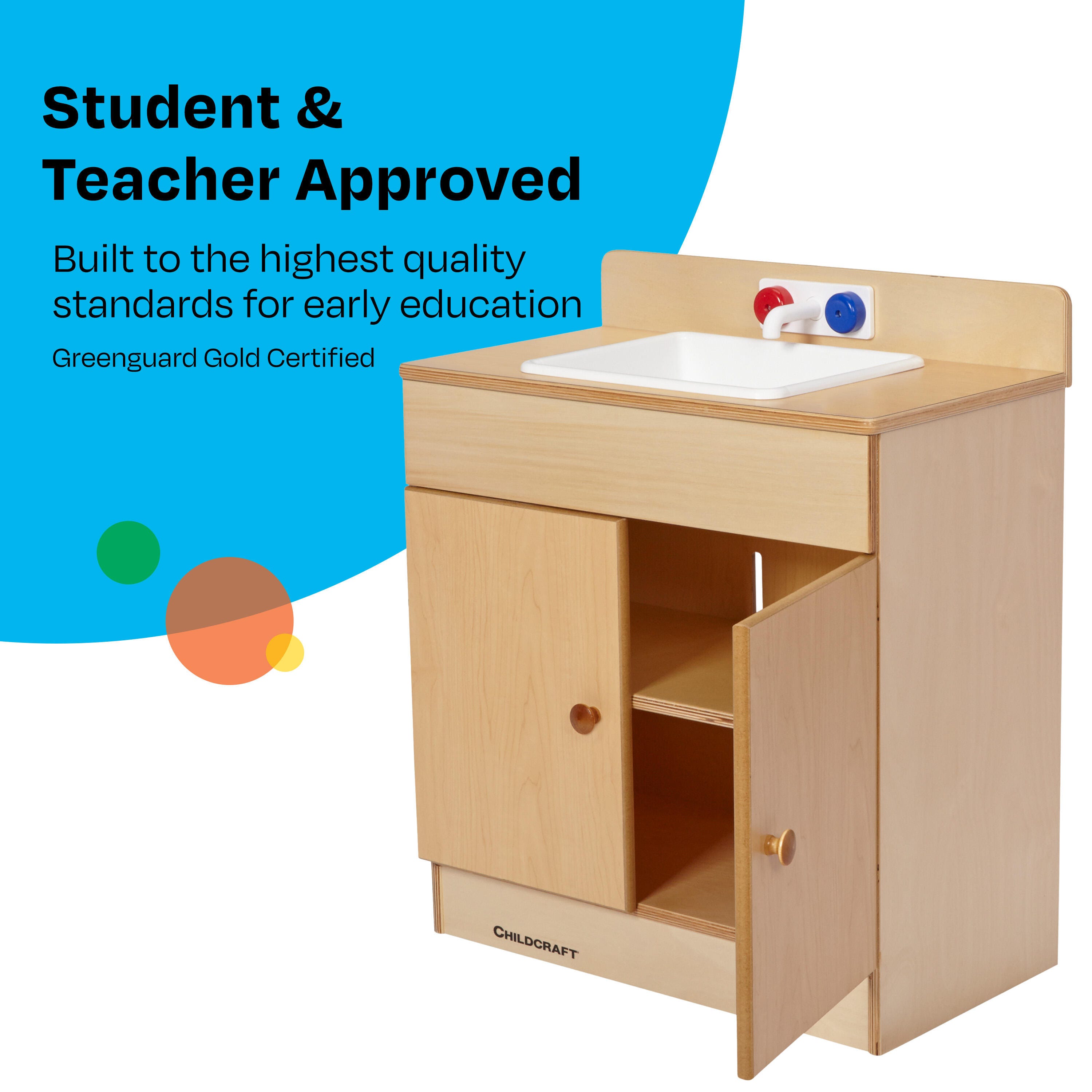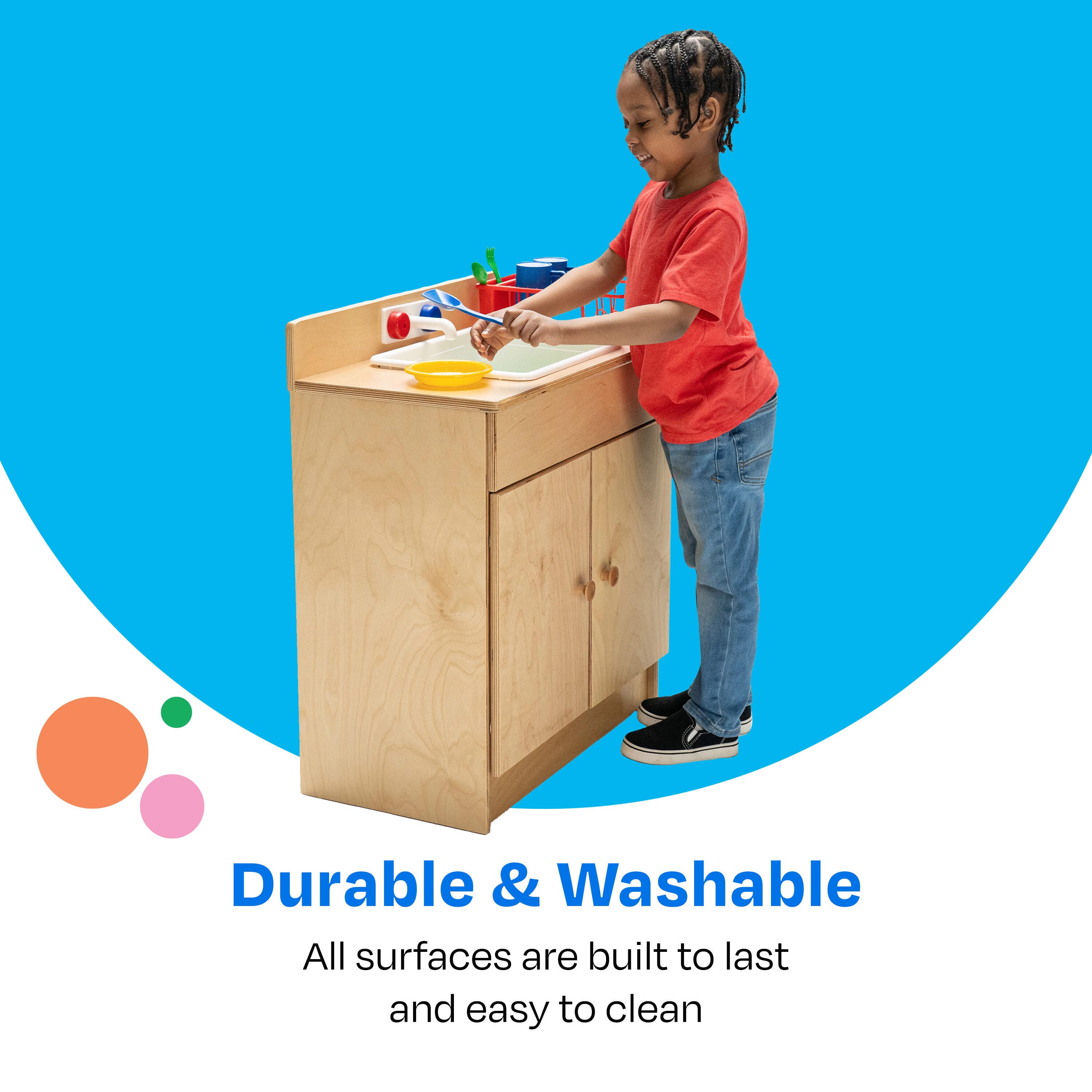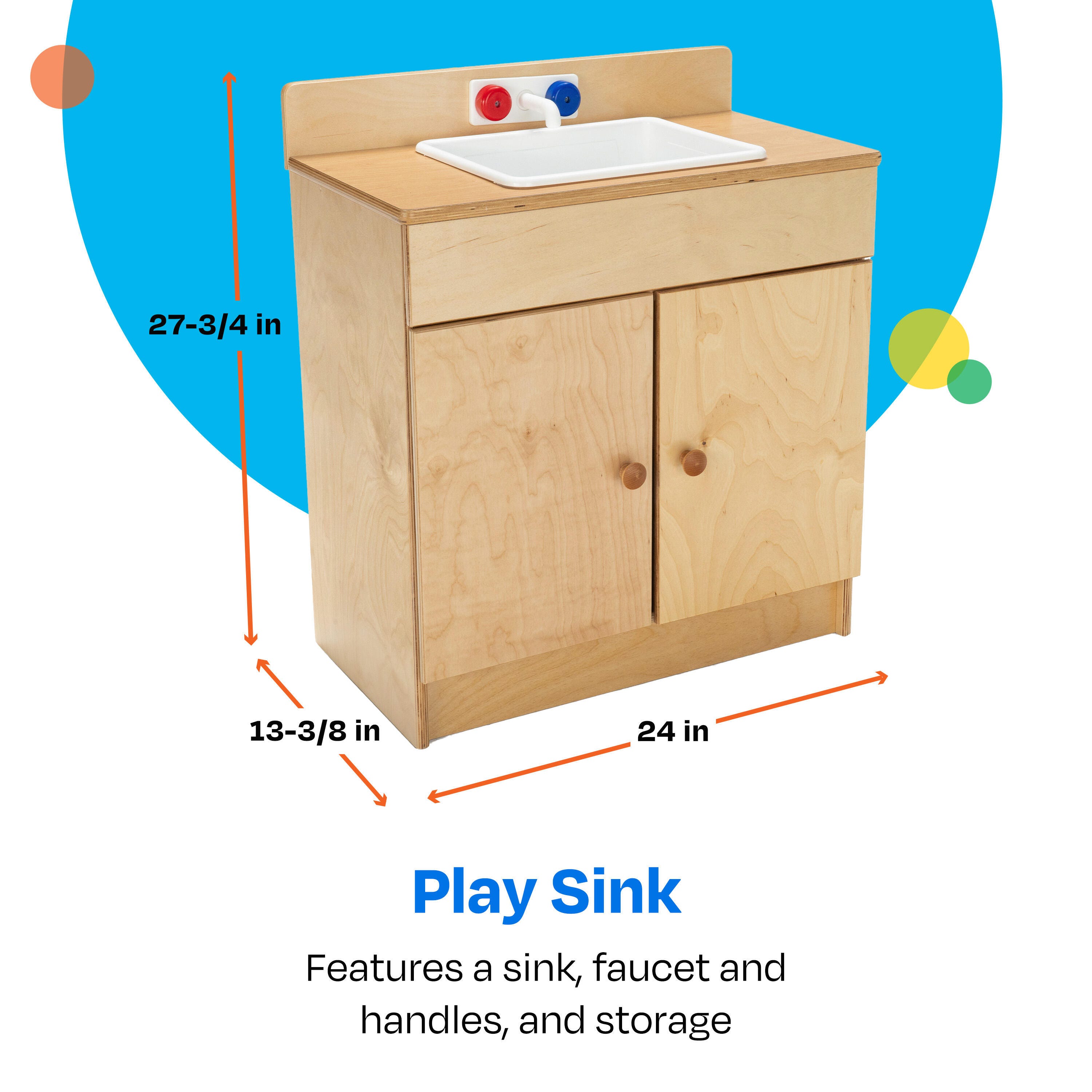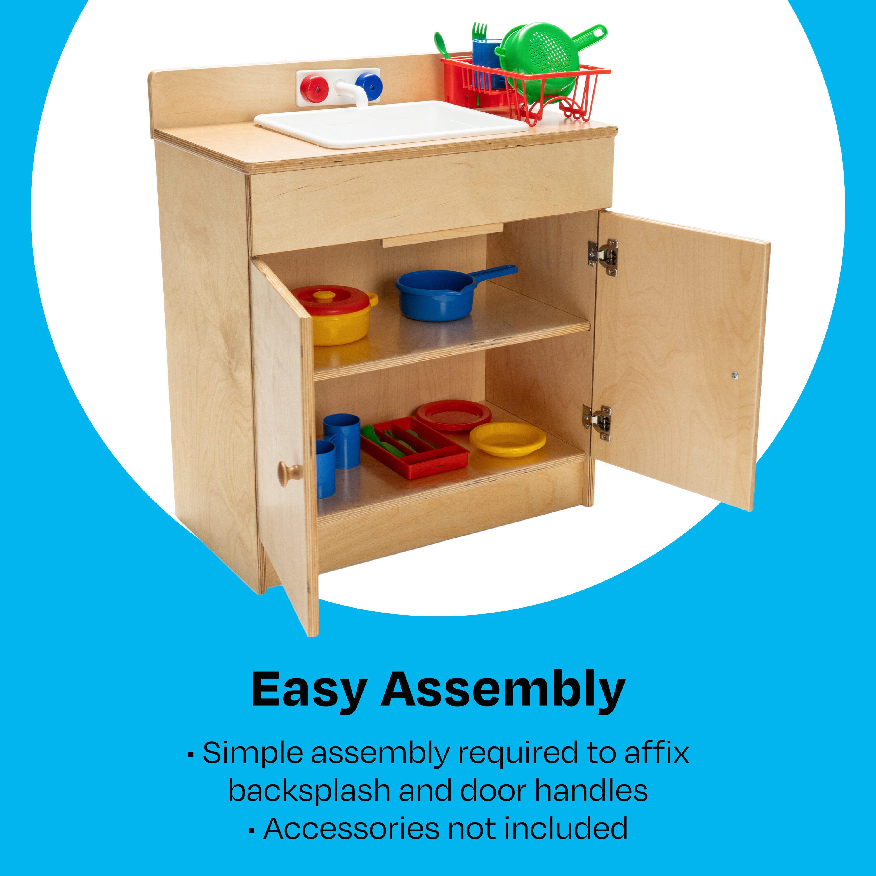 Childcraft® Traditional Play Sink is crafted for imaginative play and safe use in schools, childcare centers, and homes. The wooden play sink features two knobs, one faucet, and storage space. The full plastic laminate tops and washable surfaces make it easy to clean and maintain. Simple assembly is required to affix the backsplash and door handles, and all hardware is included. We also offer matching wooden kitchen pieces to complete your full pretend play kitchen setup. The sink unit measures 24 W x 13-3/8 D x 27-3/4 H inches.