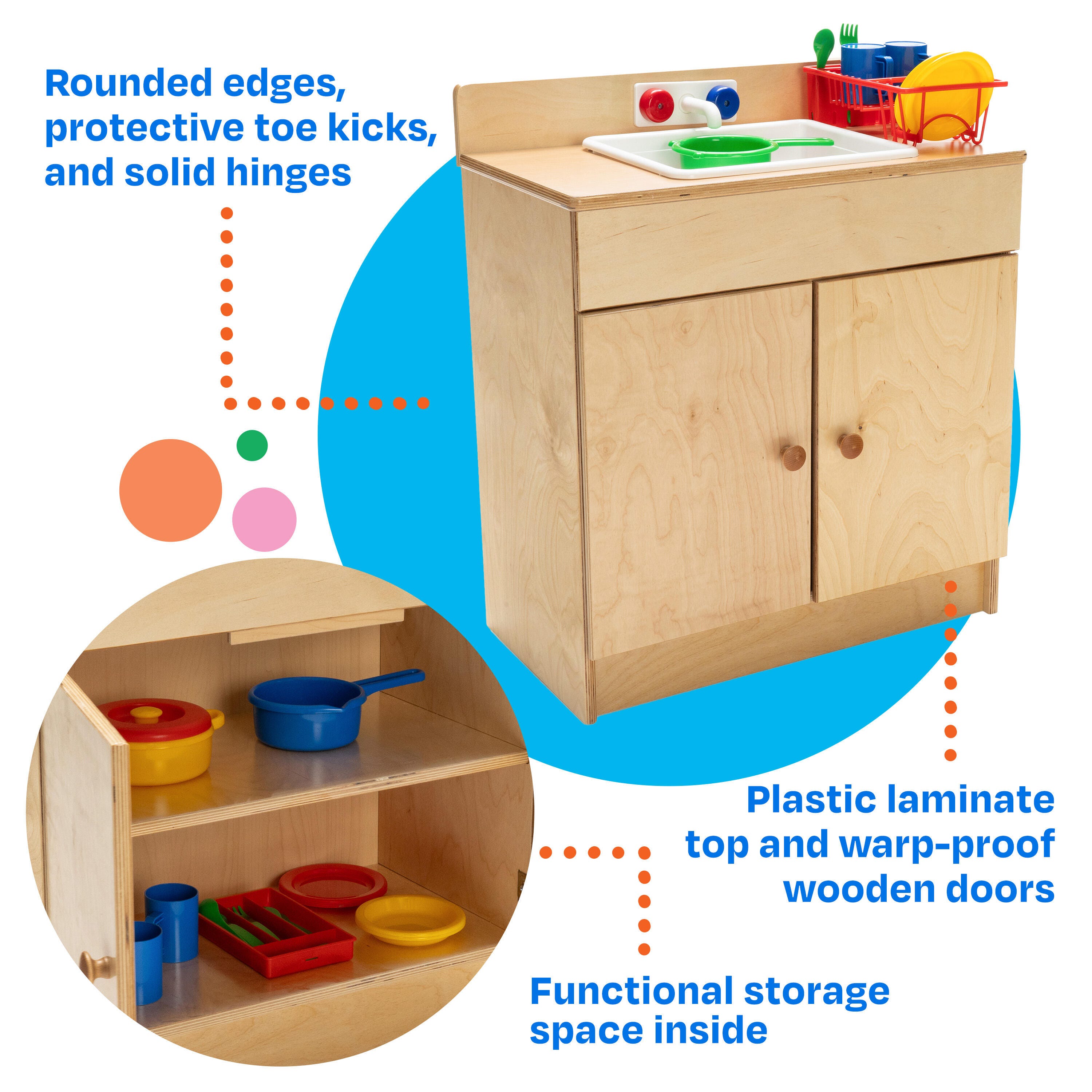 • This play sink has protective toe kicks, rounded edges, and solid hinges for added safety; durable, warp-proof doors and laminate tops for long-lasting use