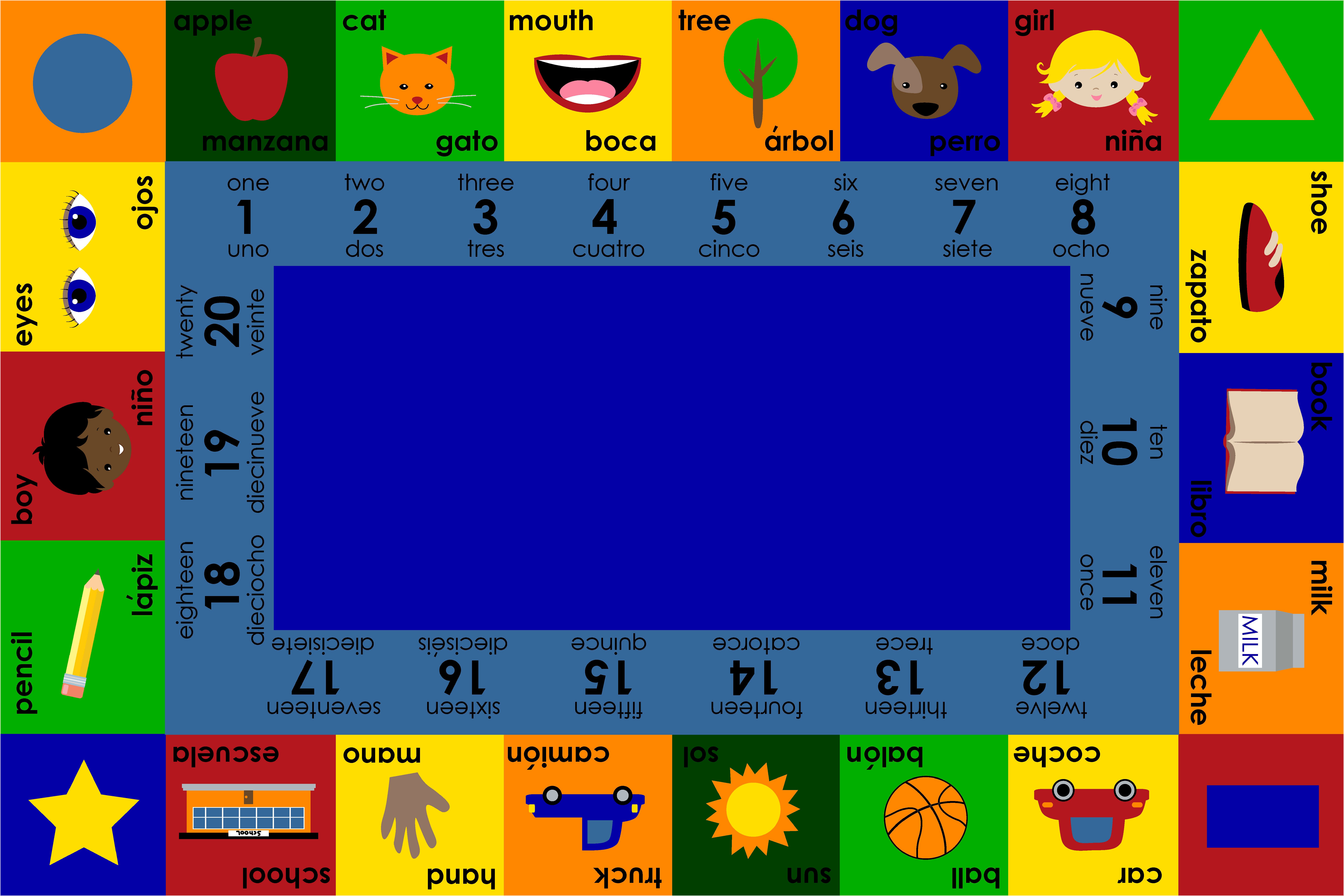 Childcraft® Bilingual Carpet for Classrooms is a rectangle carpet that features vibrant squares showcasing numbers, colors, and objects labeled in both Spanish and English. Perfect for classrooms, preschools, or playrooms, this interactive carpet encourages early literacy and numeracy skills. The outer border includes 22 grid seats with familiar objects/shapes/animals and their names in both languages, while the inner border displays sequential numbers from 1 (uno) to 20 (veinte). Each Childcraft carpet is performance tested for durability, color fastness, and stain and soil resistance for quality you can trust. Please Note: Childcraft® carpets are custom designs that are made to order and are therefore non-returnable.