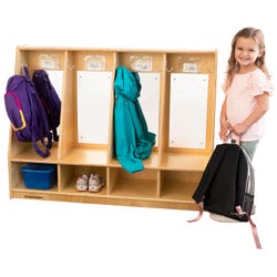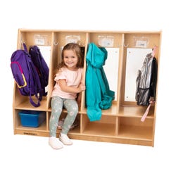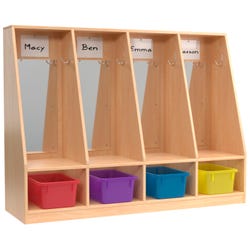 Childcraft® Toddler Bench Coat Locker is designed with young learners in mind. Perfect for early childhood classrooms and preschools, this locker offers 4 individual sections with double aluminum coat hooks, a mirror, and a convenient bench seat for sitting while putting on shoes or jackets. Each locker section includes an acrylic name plate for personalization, helping young children identify their belongings. The bottom cubbies fit trays for shoes or supplies (sold separately), while the birch plywood construction provides long-lasting durability. Measures 47-3/4 W x 14-1/4 D x 36 H inches; each locker section measures 11-3/16 W x 25-3/8 H inches. Comes fully assembled; must be wall-mounted for safety.Features