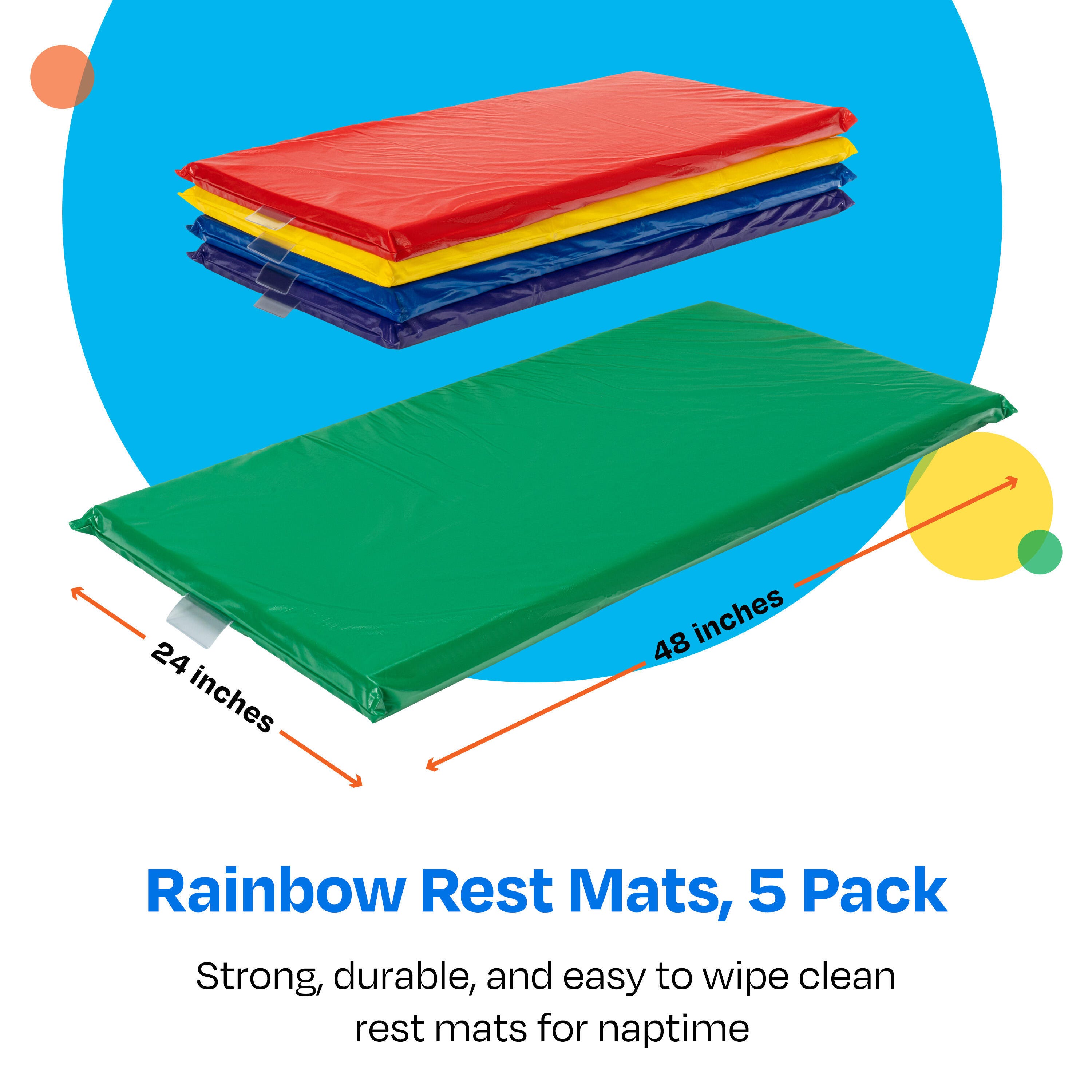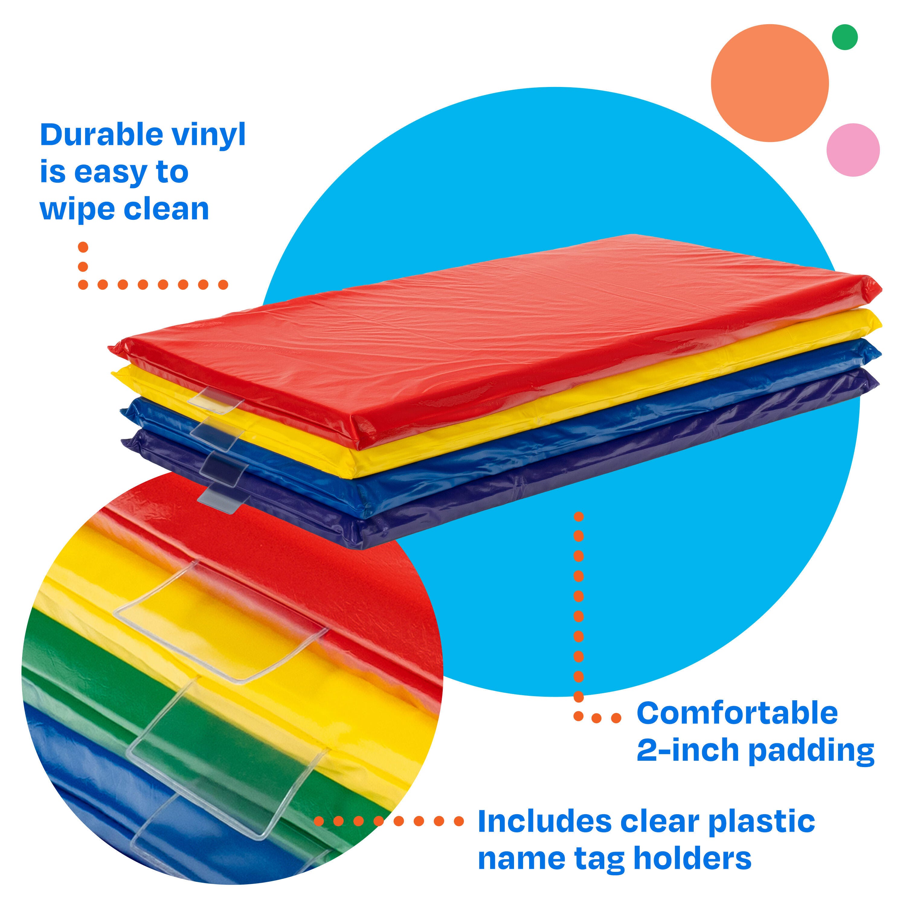 Childcraft® Rainbow Rest Mats for classrooms are the perfect solution for naptime and relaxation. Each mat is padded and easy to wipe clean, combining comfort and durability for students and teachers. The sleeping mat is made using radio frequency vinyl welding technology to seal all seams and protect the foam padding from liquid and bacteria. Wipe clean to disinfect after each use. This set includes 5 fun colors: Red, Yellow, Green, Blue, and Purple. Each sleeping pad includes a clear nametag holder and is lightweight and simple to take out/put away.Features