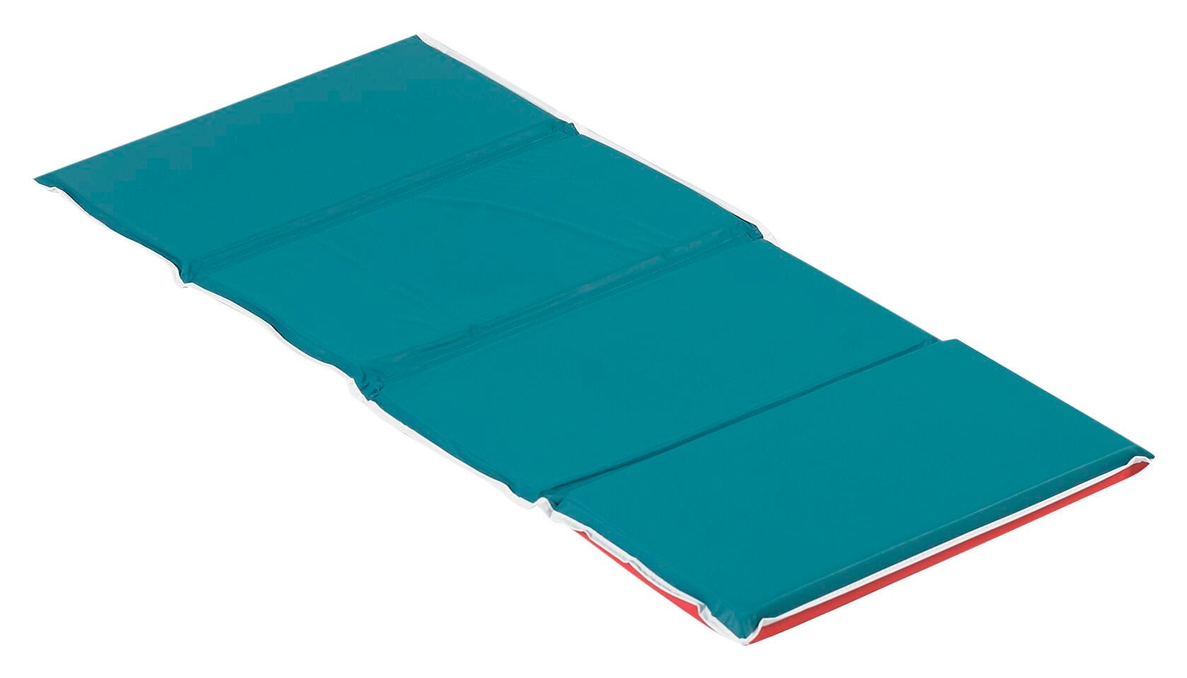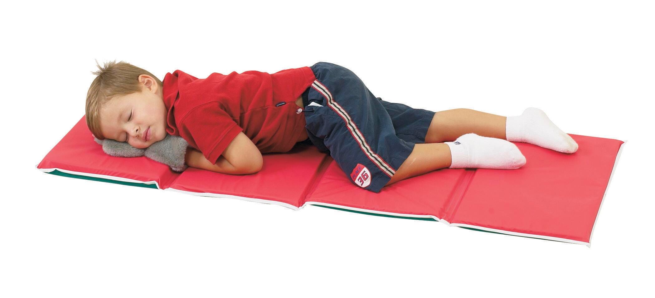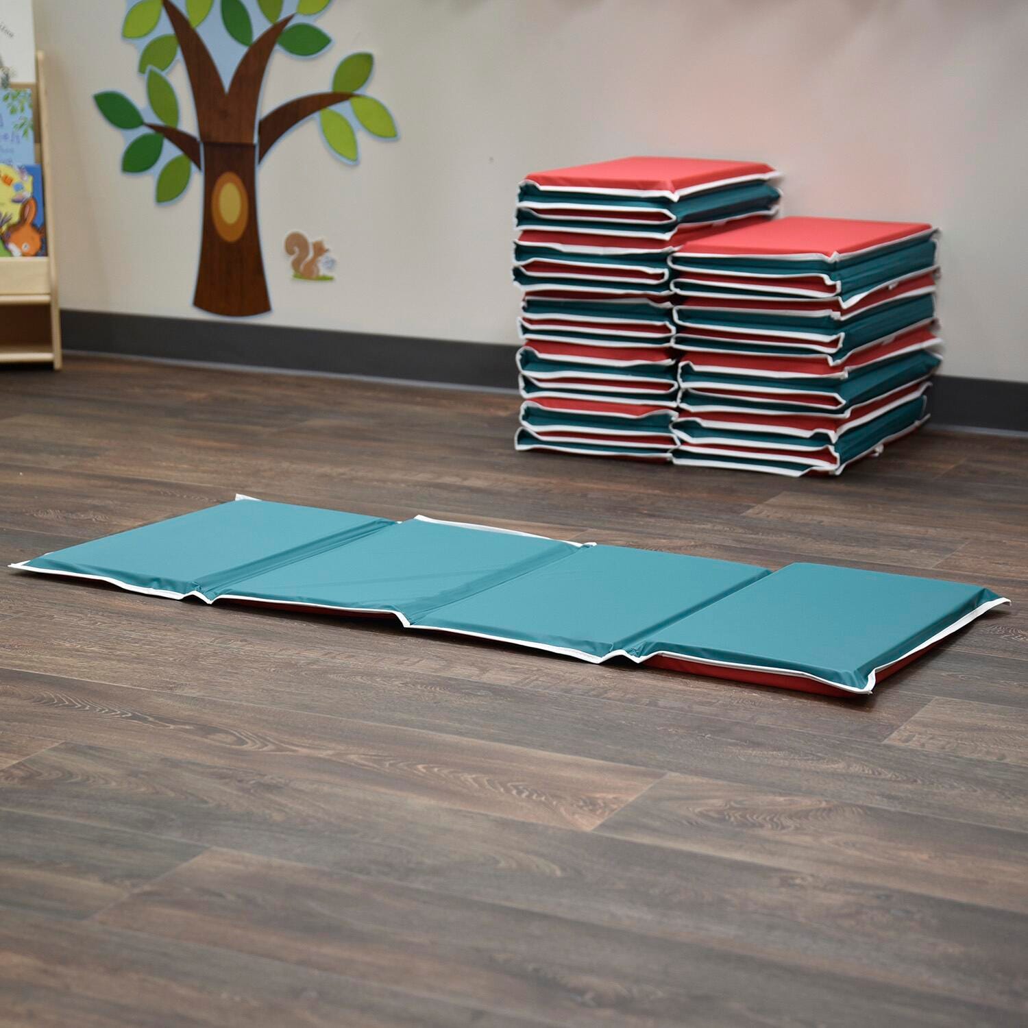 Rest mat with a built-in pillow! This 4-section mat has waterproof seals between sections to protect foam padding, designed for a long-lasting naptime experience year after year. One of four soft foam pieces is twice as thick to provide a soft pillow for nap time. Designed waterproof and easy-to-clean. Comfy mat easily folds to 12-3/4 L x 20 W x 4 H inches for convenient storage, and measures 46 L x 20 W, with a thickness of 3/4 H inches when unfolded. Pack of 10.