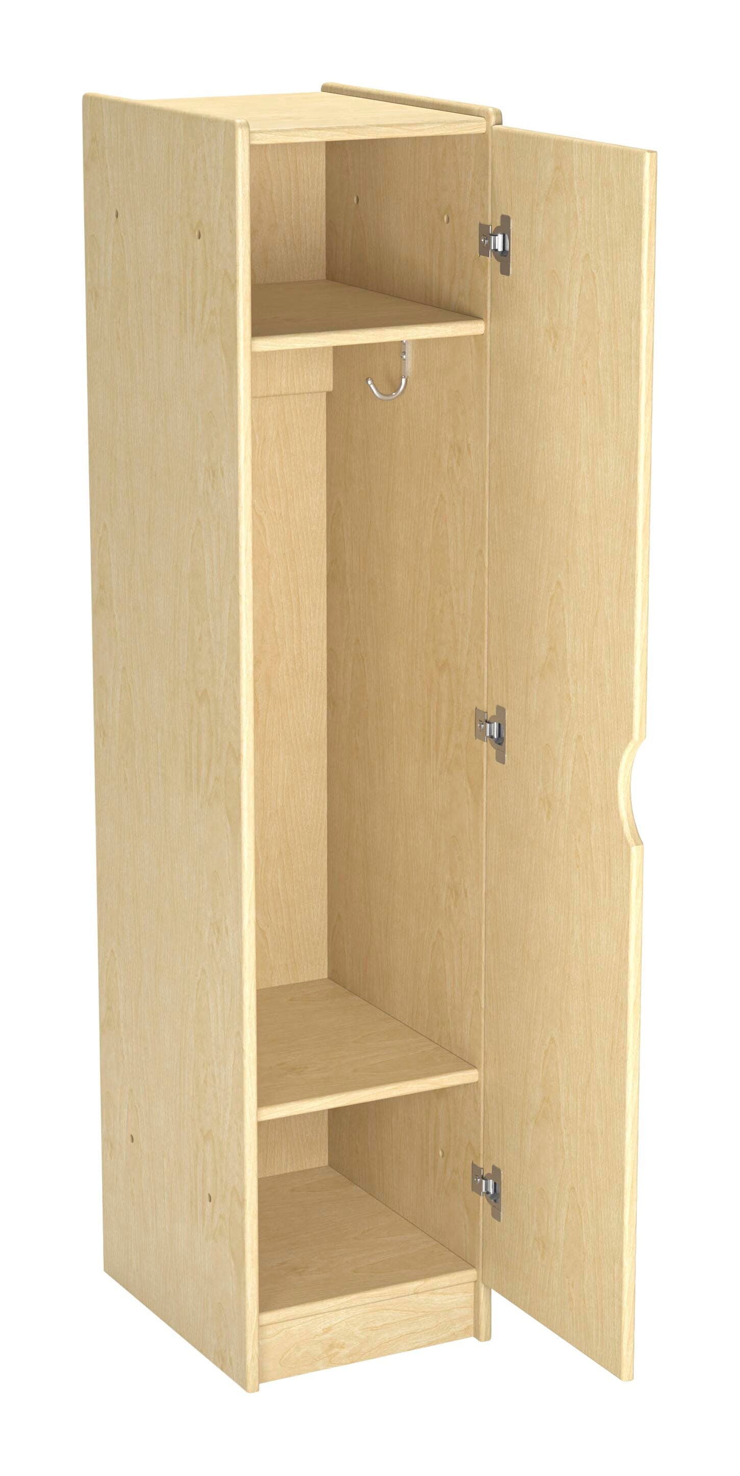 Childcraft® Modular Coat Locker offers a compact and easy way to keep student belongings organized and out of sight. This wooden locker includes aluminum coat hooks and two cubbies (one above and one below), perfect for holding backpacks, shoes, lunches, and other school supplies. Designed for versatility, two or more of these classroom lockers can be bolted together to fit the specific needs of your space. The narrow footprint makes them ideal for fitting multiple units along walls while keeping items accessible to young learners. The slim locker measures 11-1/4 W x 14-1/4 D x 50 H inches. Comes fully assembled. For safety, units must be wall-mounted; not recommended as a room divider.Features