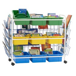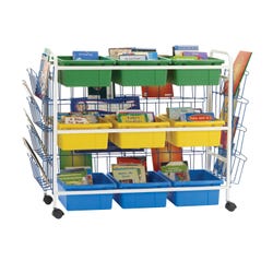 With three rows of deep tub storage, there are endless organization possibilities within the classroom or library. These carts are the ideal height for students and teachers to easily view and take books. All carts feature four 2-inch locking casters. Lifetime frame and tub warranty. Open Tubs measure 12 W x 15 D x 6 H inches. Divided Tubs measure 12 W x 15 D x 6 H inches. Frame measures 49 W x 21 D x 36 H inches. Deluxe browsers include 2 small and 1 large book display racks.