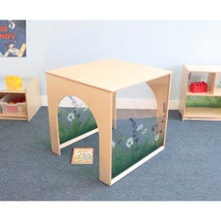 An innovative retreat for children! The unique biophilic design of this play house features safe, shatterproof acrylic side walls imprinted with an image of wild flowers in a field that beckons children inside for a peaceful break yet provides easy visibility for adult supervision. The bright and cozy interior features large tunnel openings on each end panel for easy access and maximum visibility of children inside. Coordinates with all other pieces in our Nature View Room Divider Collection [each sold separately]. Bring nature indoors and create a quiet space that children will love! Satisfies every state requirement for 'quiet space' in Early Learning classrooms.
