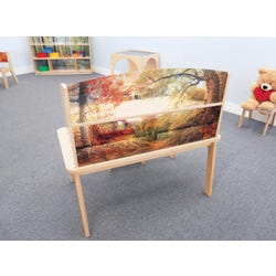A fresh interpretation of a child's writing center that lends a striking design accent! The alluring forest scene printed on the clear acrylic back panel invites children to sit down and write, draw, create, read, play, or whatever the classroom activity entails on an ample work surface. There's plenty of storage for papers, books or other activity materials and the clear panel provides unobstructed visibility of children for adult supervision. The desk surface is 20"H. Coordinates with all other pieces in our award-winning biophilia-inspired Nature View Collection. Constructed in beautiful, sturdy 1" birch plywood in safe, non-toxic natural UV finish that won't yellow and withstands rigorous use.Features