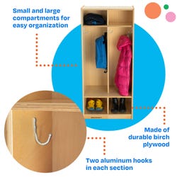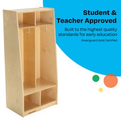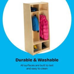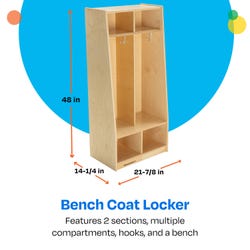 Childcraft® Bench Coat Locker combines convenience and durability with a thoughtful design. Ideal for schools, daycare centers, and homes, the children’s coat locker features two spacious sections with two aluminum hooks per section, offering plenty of space for outerwear, backpacks, and more. The upper and bottom compartments provide additional room for shoes, lunchboxes, or supplies, ensuring all items stay neatly organized. Made with durable birch veneer panels and finished with a UV-cured acrylic coating, this storage unit is built to withstand frequent use and cleaning. Use alone or combine with other Childcraft coat lockers for additional locker space. Comes fully assembled; secure the unit to a wall for safety and stability. Not recommended as a room divider. This locker with bench measures 21-7/8 W x 14-1/4 D x 48 H inches; accommodates up to 4 children.Features
