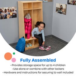 Enhance classroom organization and meet children’s needs with this versatile wooden locker with benches. Designed to accommodate up to 4 children.