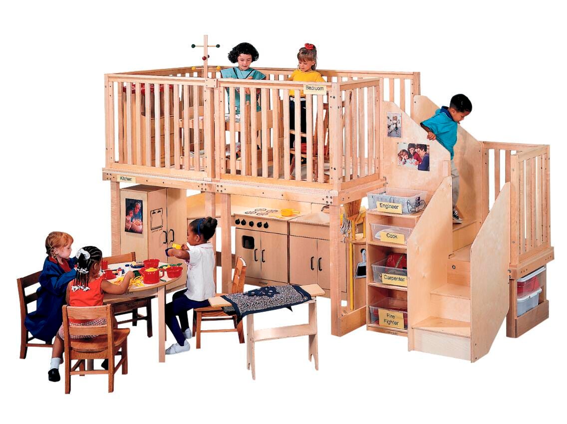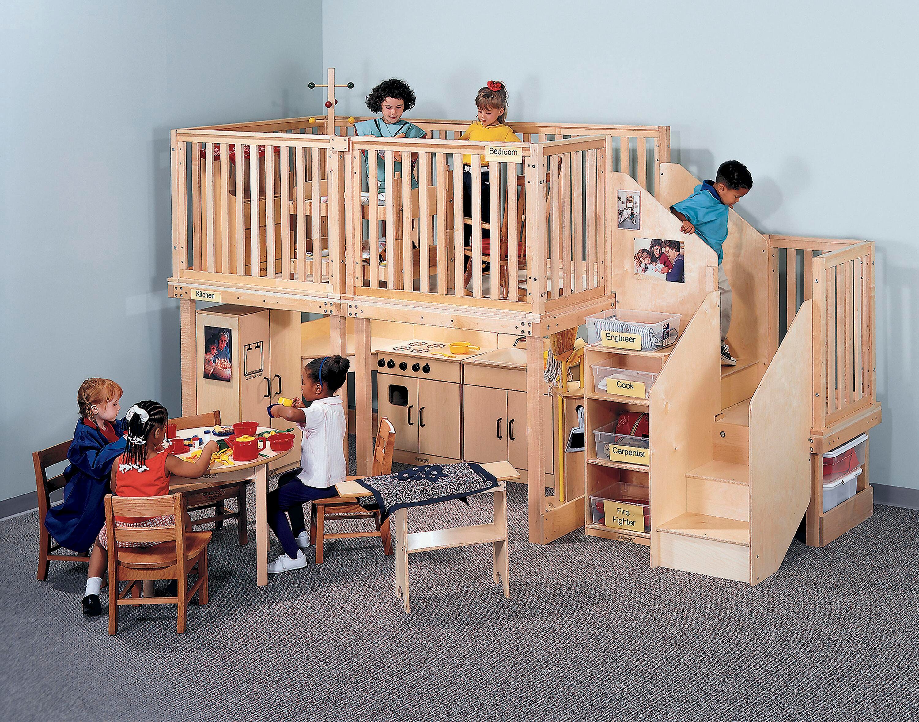 - Lofted design optimizes classroom space, creating storage or reading areas below