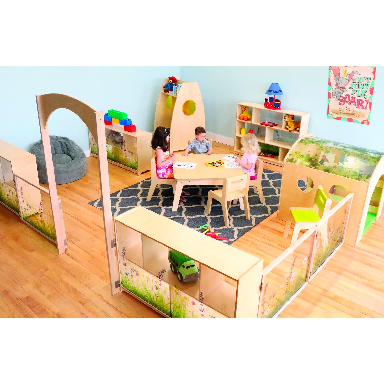 Create a unique nature-inspired divided room area! This 24-1/4-inch high, 36-inch wide room divider panel features a safe, shatterproof clear acrylic panel imprinted with an inviting nature scene that brightens and defines any room environment while providing maximum child visibility and supervision. All corners and edges are rounded over and finished smooth for safety. Use the connector panel accessory [provided] to connect the panel to other pieces in the Nature View Room Divider Collection and create a flexible divided area layout in the warmth of wood without unsightly plastic connectors.