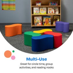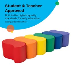 The Childcraft® Wave Stool Set provides a comfortable and playful seating solution for classrooms, libraries, play spaces, and reading nooks. Constructed with high-density foam and a soft yet durable polyurethane cover, these cushioned seats offer both comfort and stability. The curved wave design allows for multiple seating configurations, making them ideal for group learning, circle time, or independent reading. Their lightweight structure enables easy movement and quick reconfiguration to suit any classroom setting. Each children’s stool measures 9 W x 17-1/2 D x 10 H inches and is perfectly sized for young learners. The set includes 6 stools in vibrant primary colors (red, orange, yellow, green, blue, and purple).Features