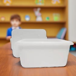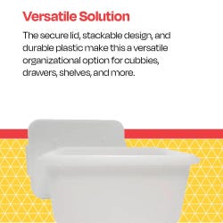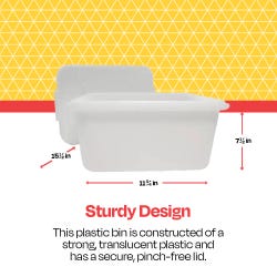 Store arts and crafts supplies, educational materials, toys, seasonal decorations, and more with the School Smart translucent storage bin with a non-snap lid. Our plastic storage bins with lids are sturdy, versatile, and stackable. Use them alone, place them alongside other storage boxes, or store them within deeper drawers in your classroom, childcare center, or home. The plastic bin has a matching lid that secures down firmly on top and helps prevent young children from taking items out.Features