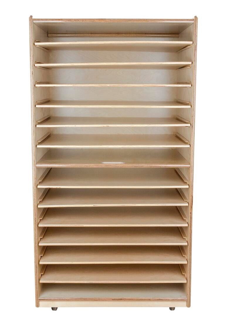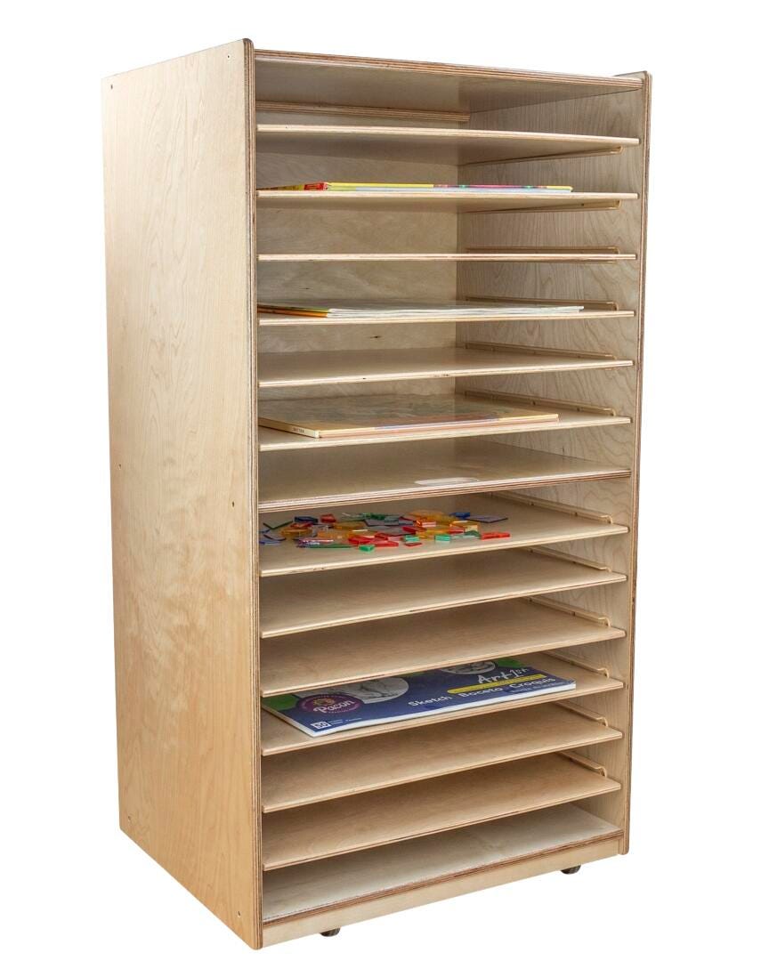 Wood Designs™ Paper, Puzzles and Games Rack features 12 removable shelves, which provide easy access to puzzles, paper, games, or more. Includes casters for easy movement. All surfaces and back are made with 100% healthy kids plywood. Measures 27 W x 21 D x 48 H inches. Weighs 139 pounds.