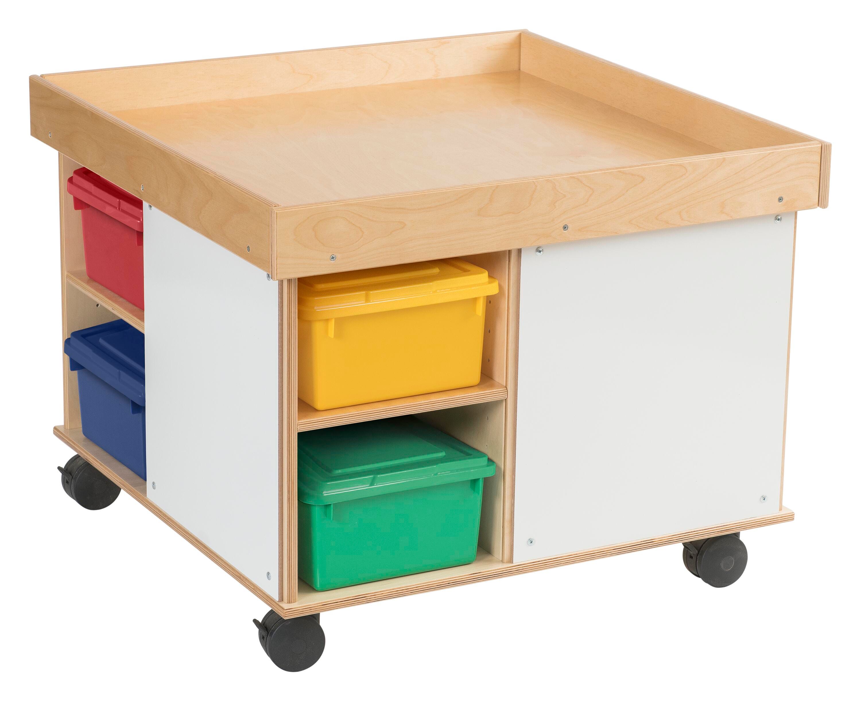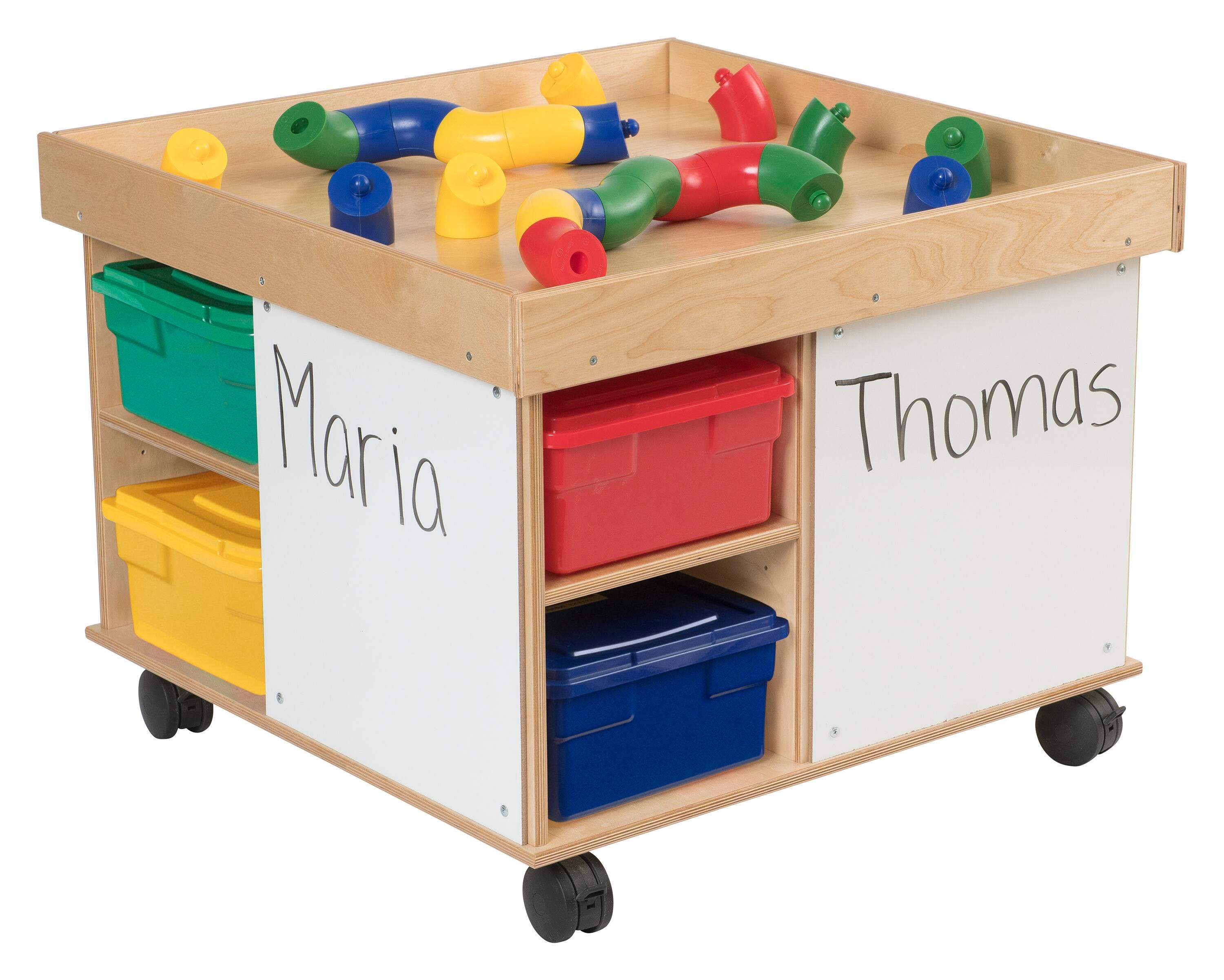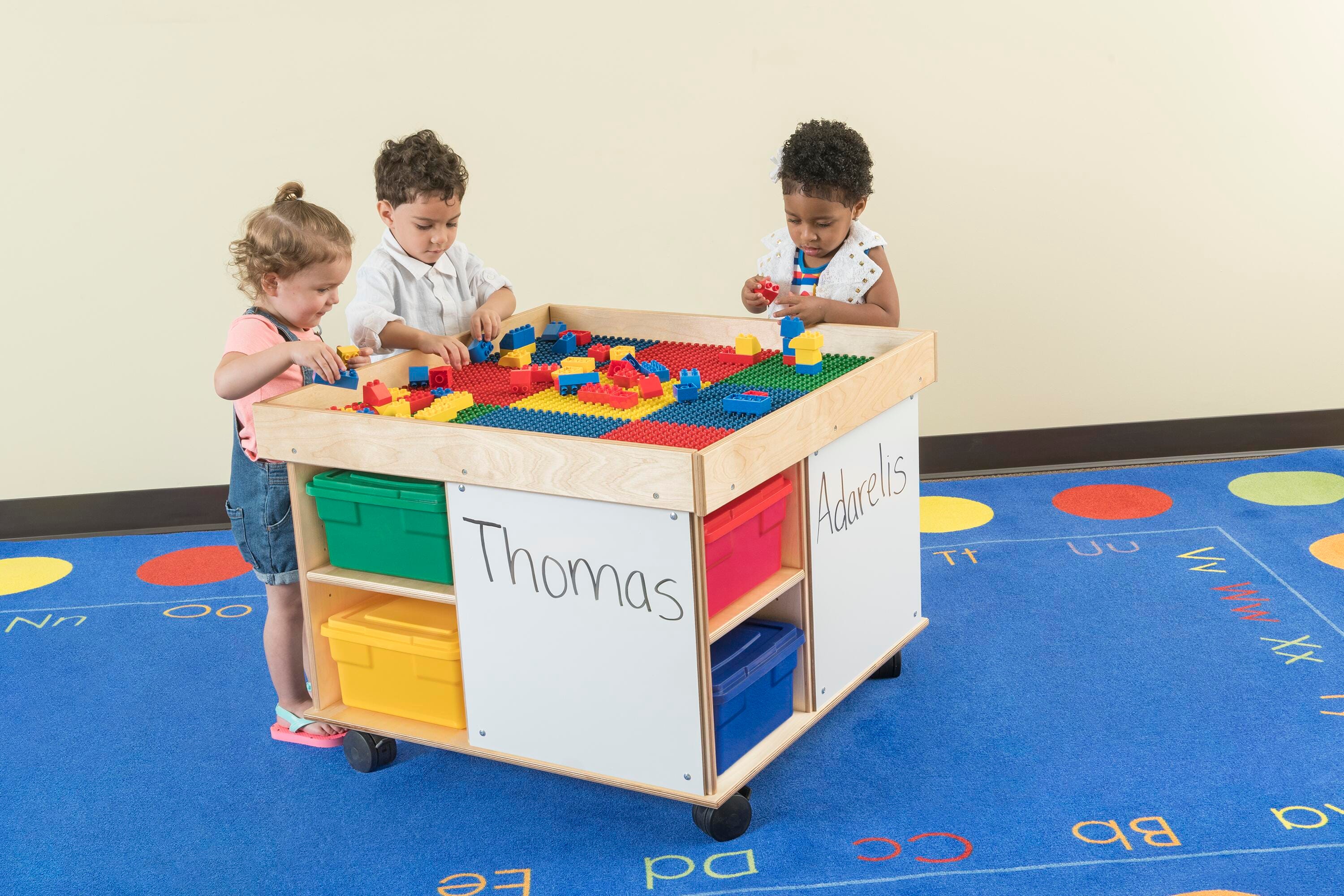 Childcraft® Collaboration Multi-Purpose Table combines a spacious activity surface with ample storage and mobility to support a variety of group activities. Featuring a removable building base top with block grids, this children’s table is perfect for block building, puzzles, and other construction play. Without the grid top, the large, flat surface is ideal for crafts, games, and collaborative projects. Whiteboards on the sides and built-in cubby spaces with colored trays make this cart a practical and long-lasting addition to classrooms, daycares, or playrooms. Four heavy-duty casters allow the table to move easily between activities, while the raised edge keeps pieces securely on the tabletop. Grid colors may vary; comes fully assembled. The play table measures 30-3/4 W x 30-3/4 D x 24 H inches to accommodate group activities.Features