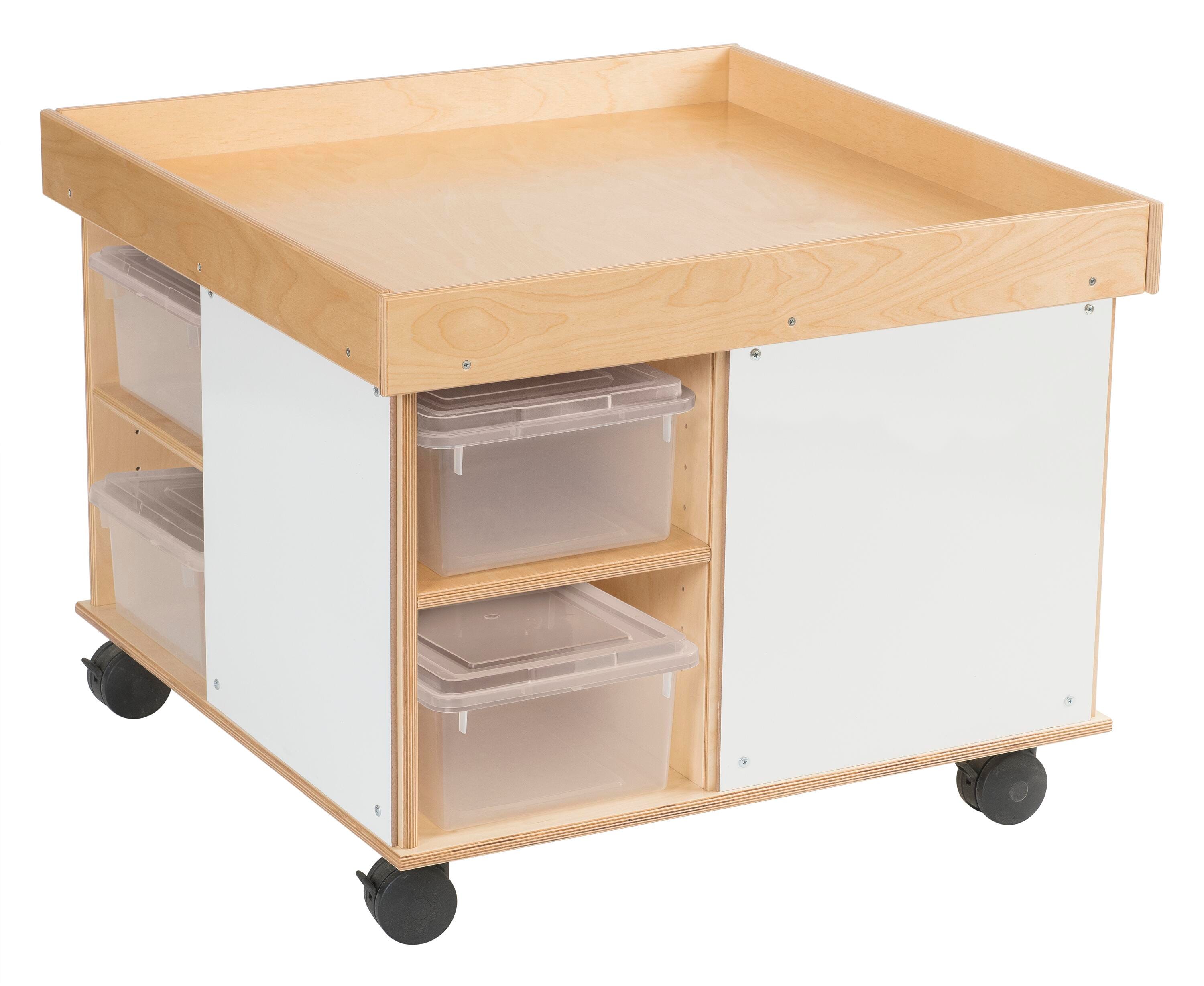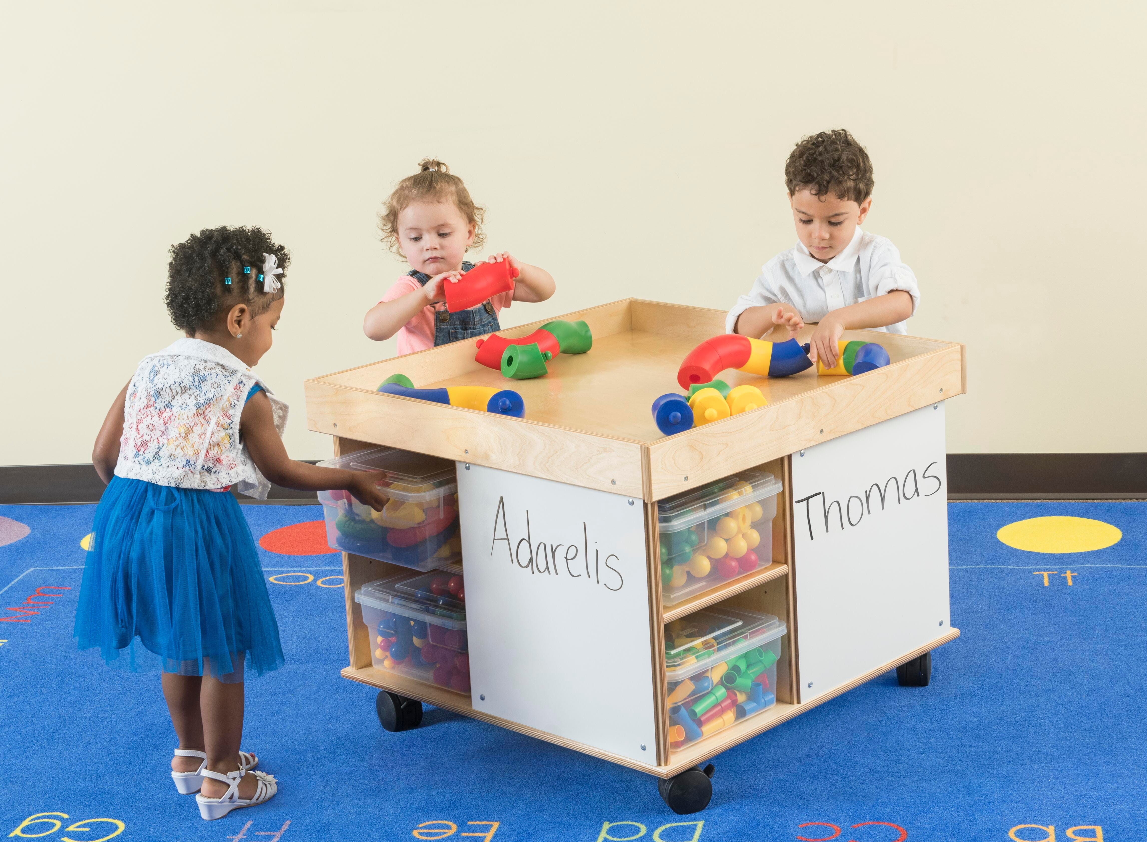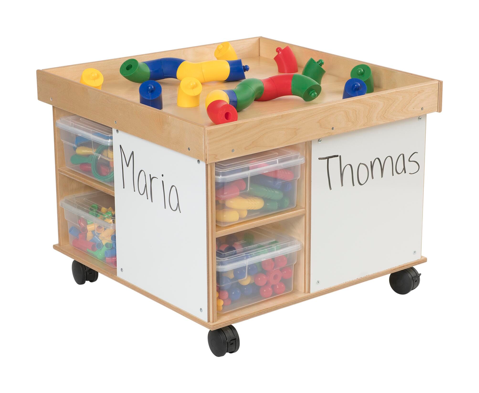 Childcraft® Collaboration Multi-Purpose Table combines a spacious activity surface with ample storage and mobility to support a variety of group activities. Featuring a removable building base top with block grids, this children’s table is perfect for block building, puzzles, and other construction play. Without the grid top, the large, flat surface is ideal for crafts, games, and collaborative projects. Whiteboards on the sides and built-in cubby spaces with translucent trays make this cart a practical and long-lasting addition to classrooms, daycares, or playrooms. Four heavy-duty casters allow the table to move easily between activities, while the raised edge keeps pieces securely on the tabletop. Grid colors may vary; comes fully assembled. The play table measures 30-3/4 W x 30-3/4 D x 24 H inches to accommodate group activities.Features