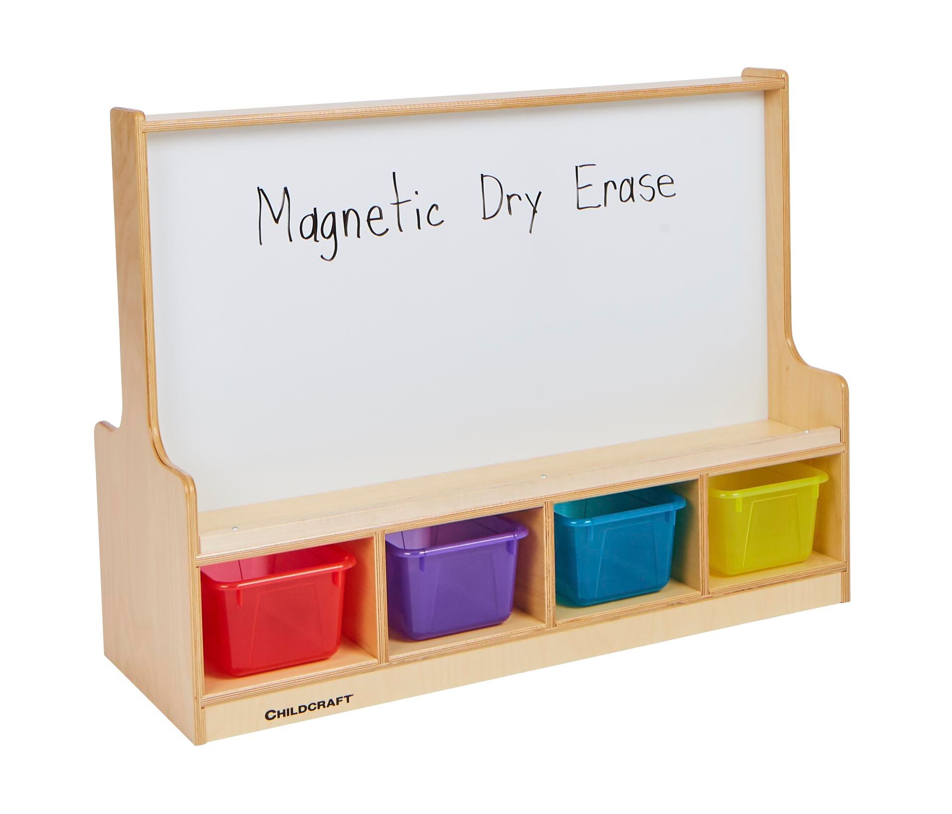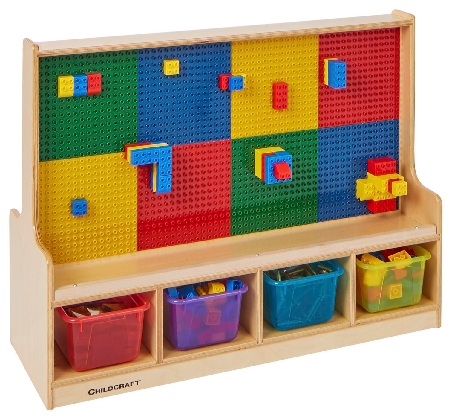 Childcraft® Dual-Sided Building-Brick Activity Center offers a perfect blend of entertainment and organization for children. One side features a multi-colored brick grid for preschool-sized building blocks, while the other side provides a magnetic dry erase board for drawing, writing, and problem-solving. The play unit includes four removable translucent-colored trays for convenient storage of bricks, markers, or other supplies. This activity center promotes teamwork and creative exploration, making it ideal for classrooms, daycares, or playrooms. Comes fully assembled. The compact activity wall measures 39-1/2 W x 14-1/4 D x 30 H inches.Features