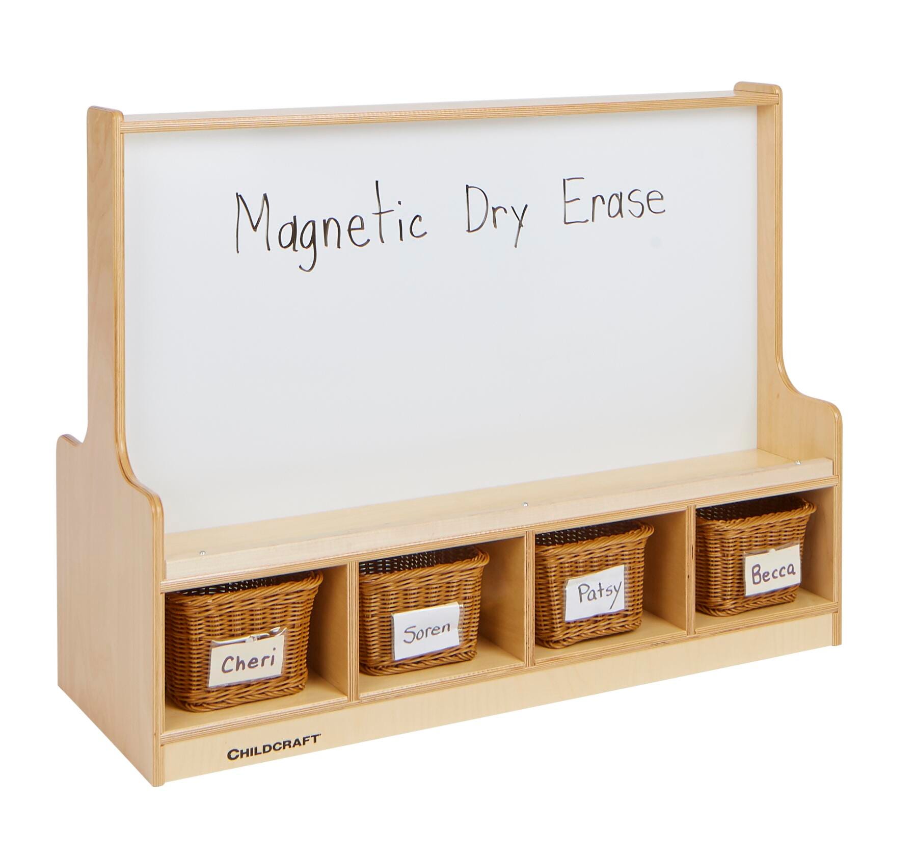 Encourage collaboration and hands-on play with this versatile dual-sided activity center featuring a preschool building grid, whiteboard, and basket storage.