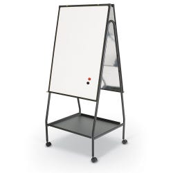 Create a space for creativity and conversation with an easel that has two unframed melamine dry erase whiteboard surfaces and flip chart hooks on both sides. Easel adjusts in height from either 59-1/2 or 65 inches. Includes four casters, two are locking. Flip Chart hooks are 17-1/2 inches apart. Measures 28-3/4 W x 27 D, with an adjustable height between 59-1/2 to 65 inches.Features