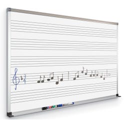 The Music Line Board makes your music room, band hall, orchestra space, or choir room more efficient, functional, and usable. Eliminate the time-consuming repetition of drawing and redrawing musical staffs. Quickly and easily draw out musical notes and symbols. Lines in each staff are 1 inch apart and are permanently laminated to a lightweight substrate for stability and durability. Low gloss porcelain dry-erase whiteboard provides superior writability and erasability with no ghosting. Reduced surface light distortion enhances visibility to provide optimum eye comfort. Anodized aluminum trim has a 7/8 inch profile with hairline-mitered corners. Boards include a full-length tackable map rail with a tackable insert, and a full-length accessory tray with rubber Dura-Safe® end caps to eliminate sharp edges. 50-Year Warranty.Features
